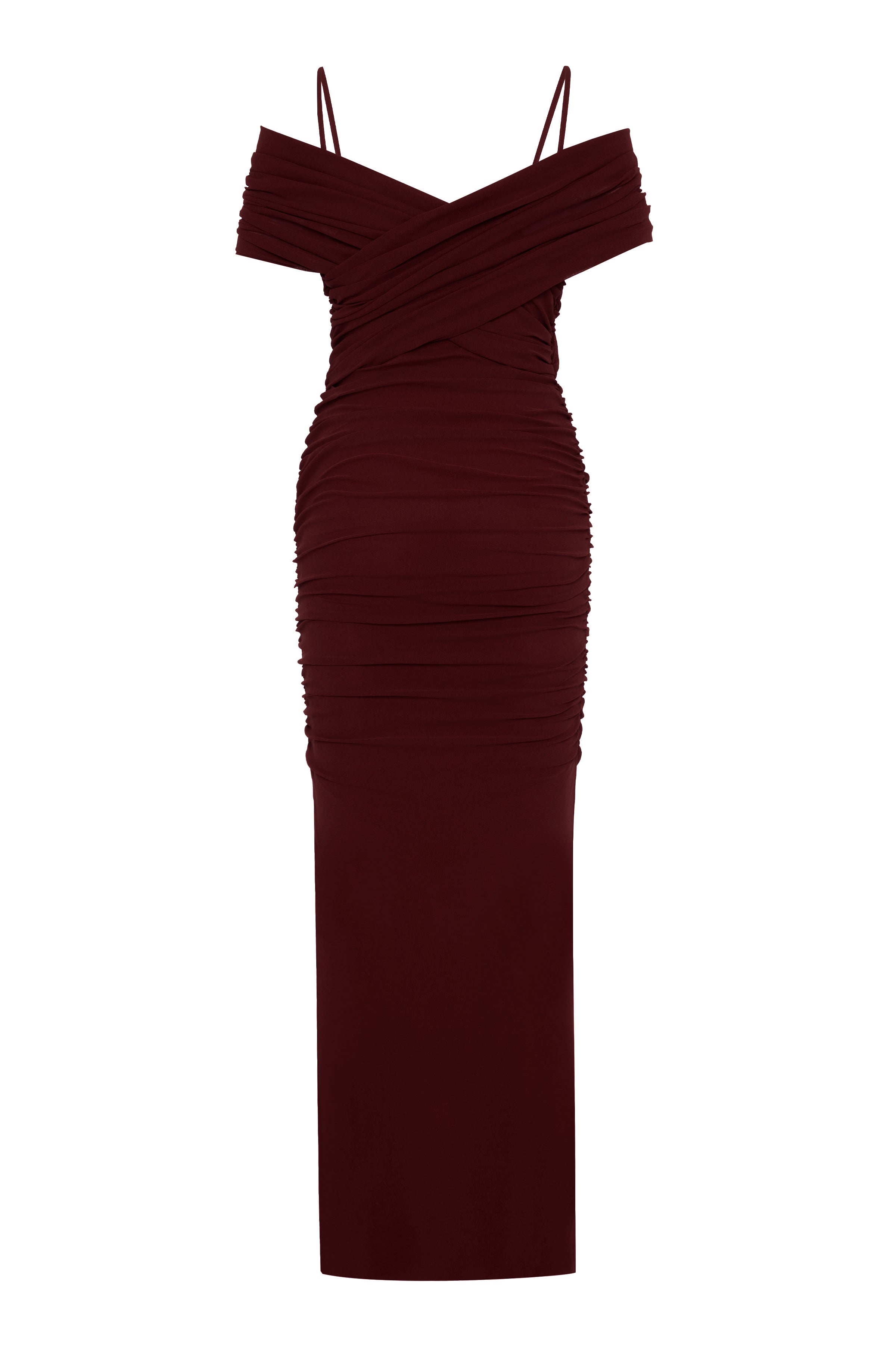 A long stretch tulle dress with thin straps is finished with an integrated crossover bolero detail that accentuates the elegance of the shoulders.