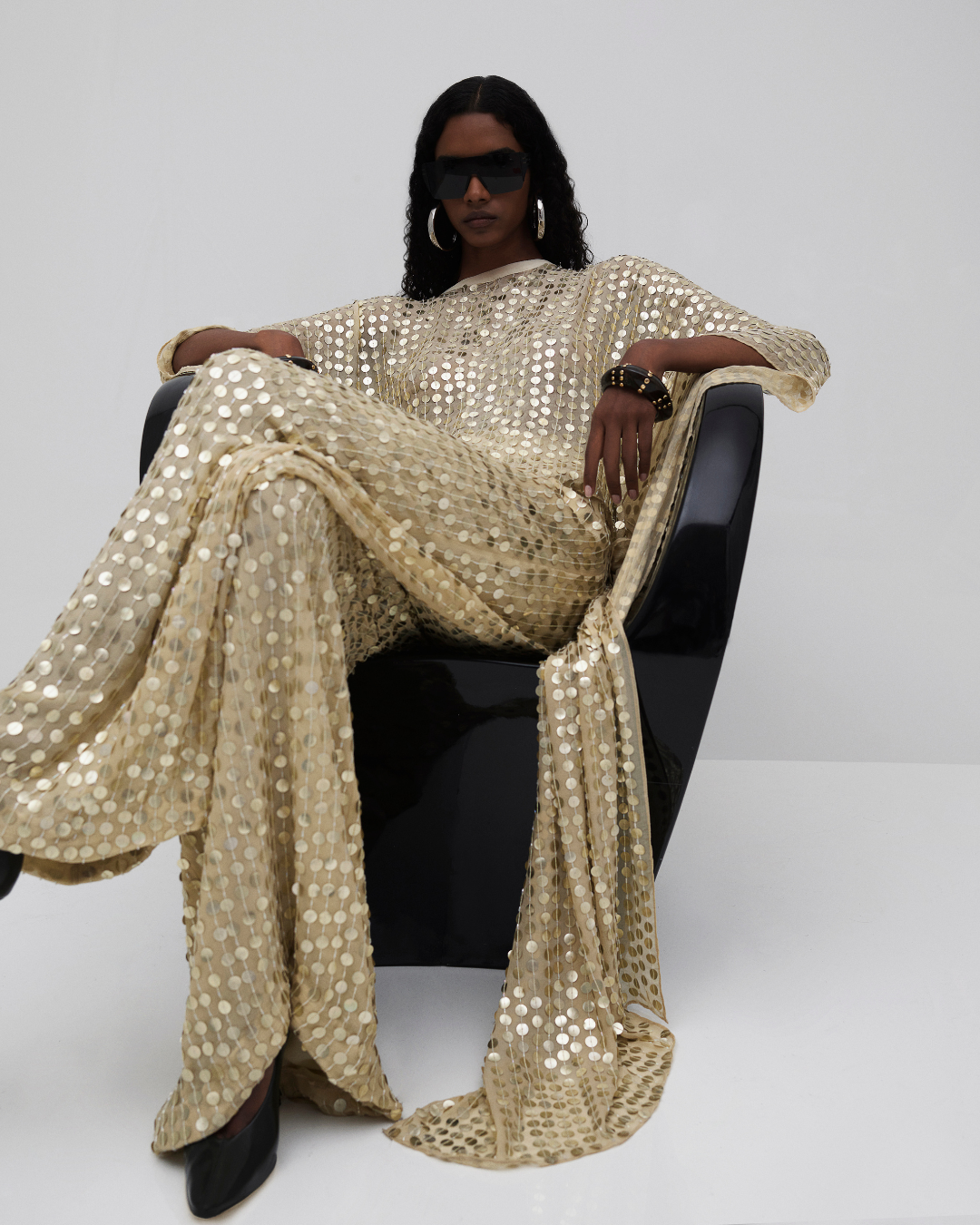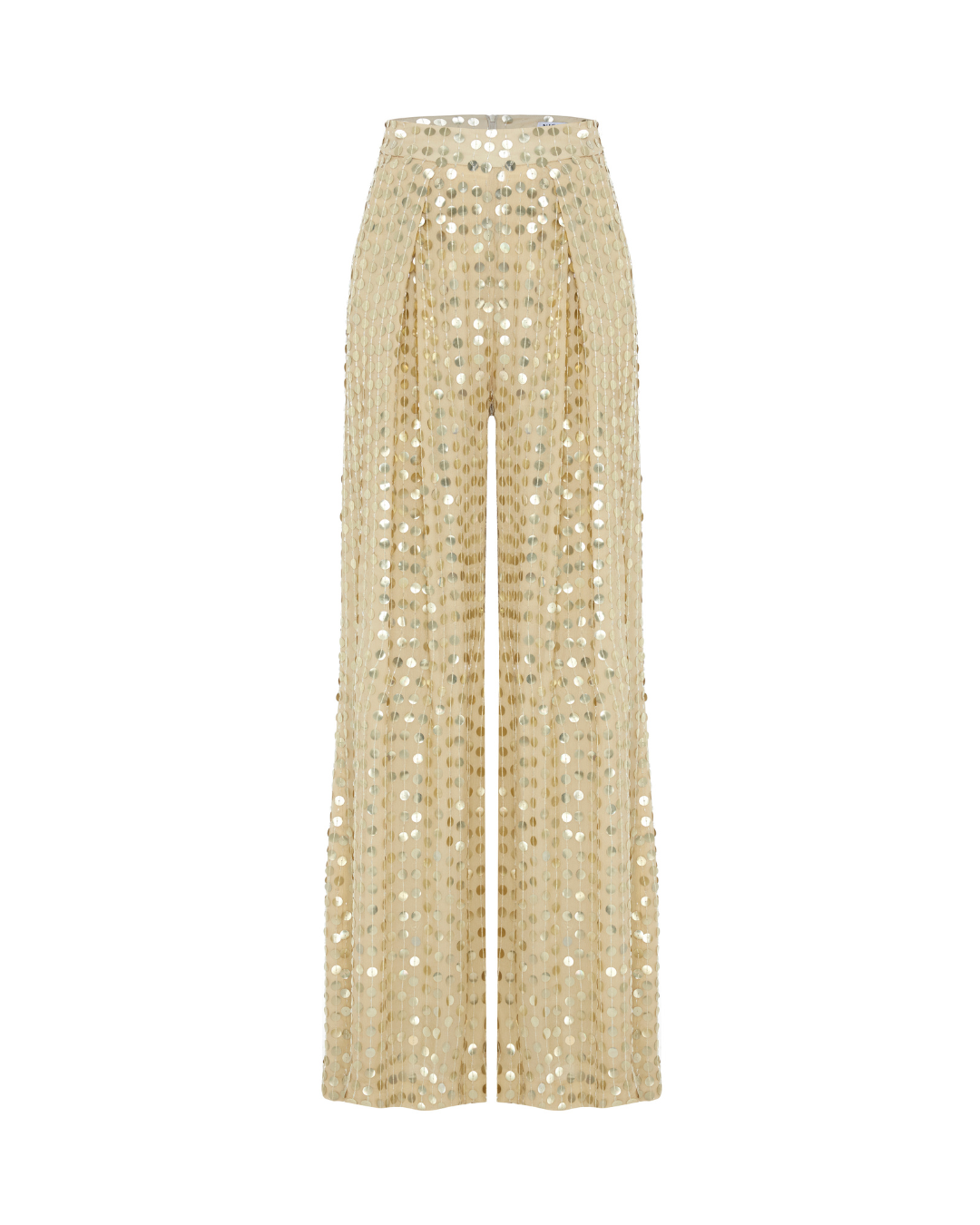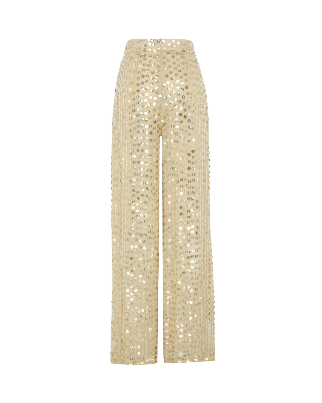 These wide-leg trousers are crafted from a silk base and intricately embellished with sequins that shimmer beautifully as they move. A statement silhouette that combines fluidity with timeless elegance.
