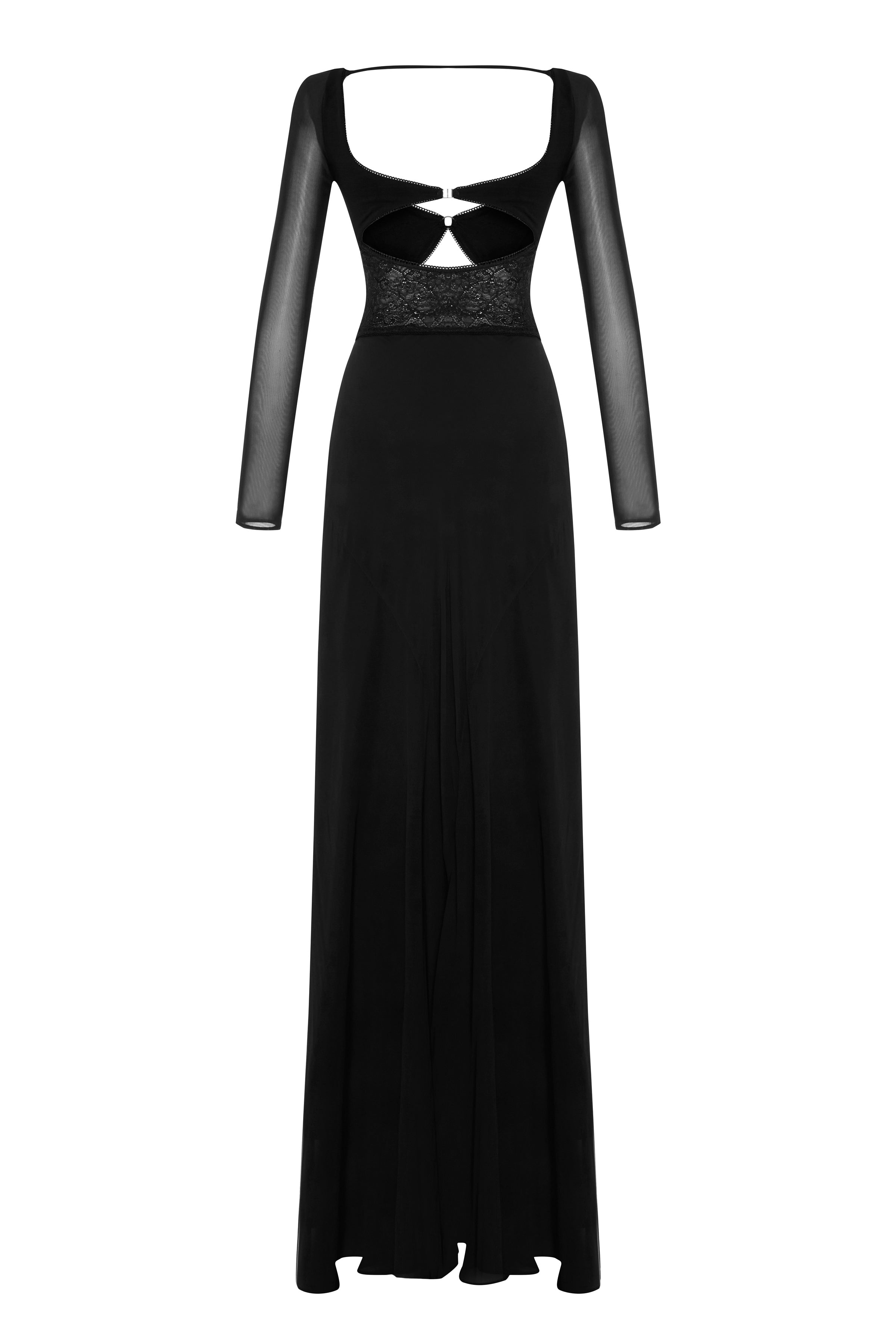 This draped, strapless long dress, with its bustier-inspired bodice, stands out with its unique geometric neckline and captivating, seductive silhouette.