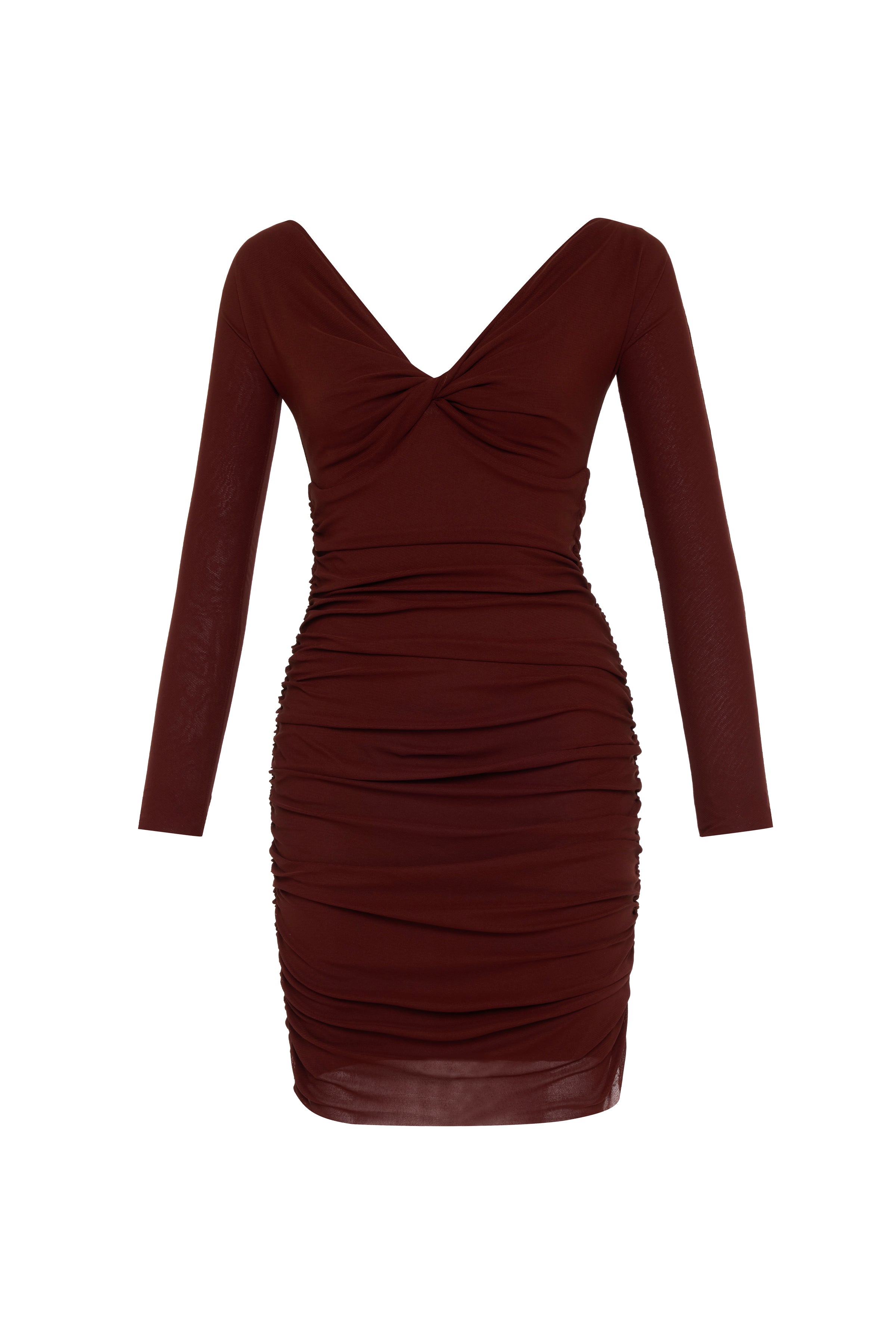 This long-sleeved, short, stretch tulle draped dress features a bold, deep V-neckline and a back zipper that extends from top to bottom, creating a bold and elegant silhouette.