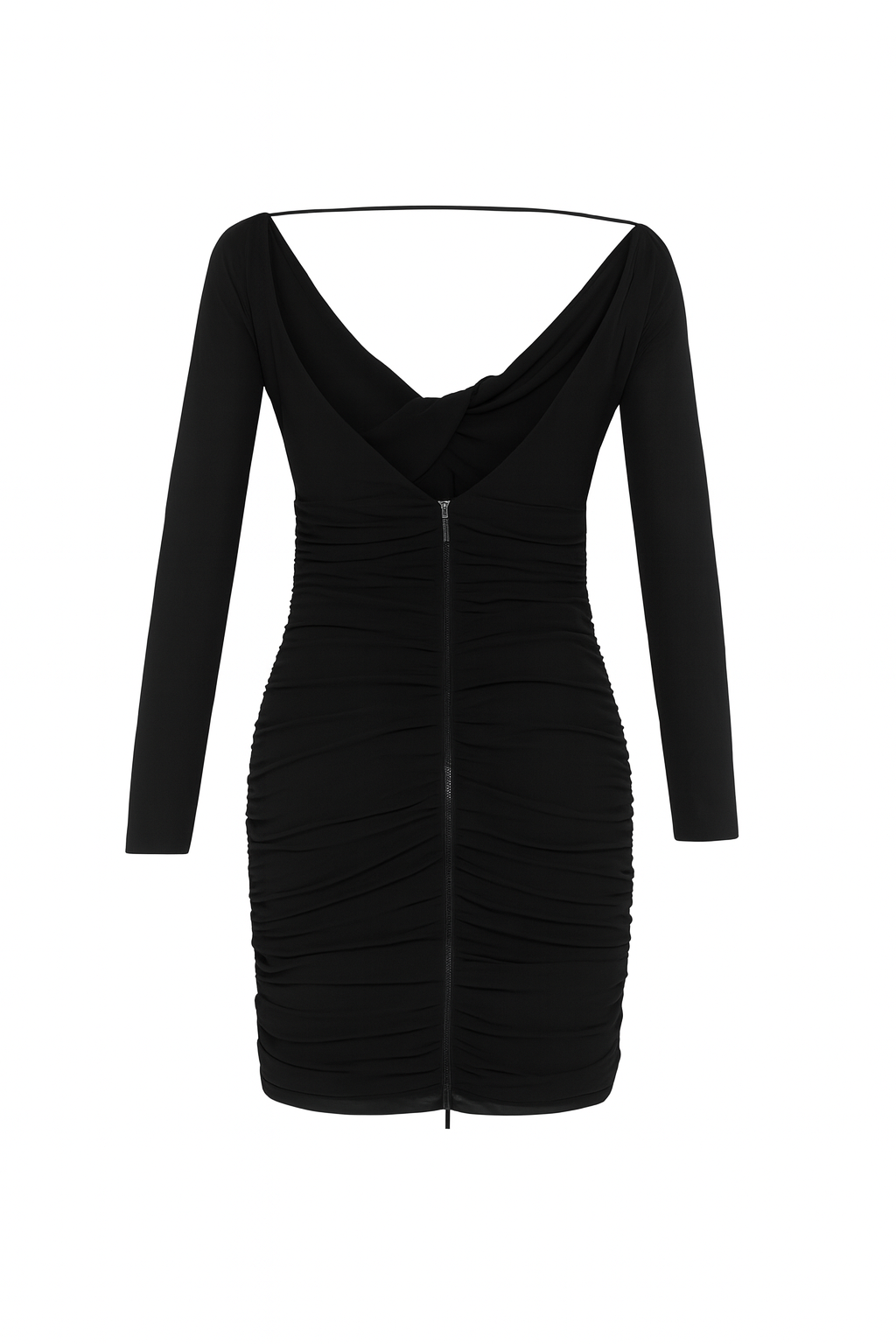 This long-sleeved, short, stretch tulle draped dress features a bold, deep V-neckline and a back zipper that extends from top to bottom, creating a bold and elegant silhouette.
