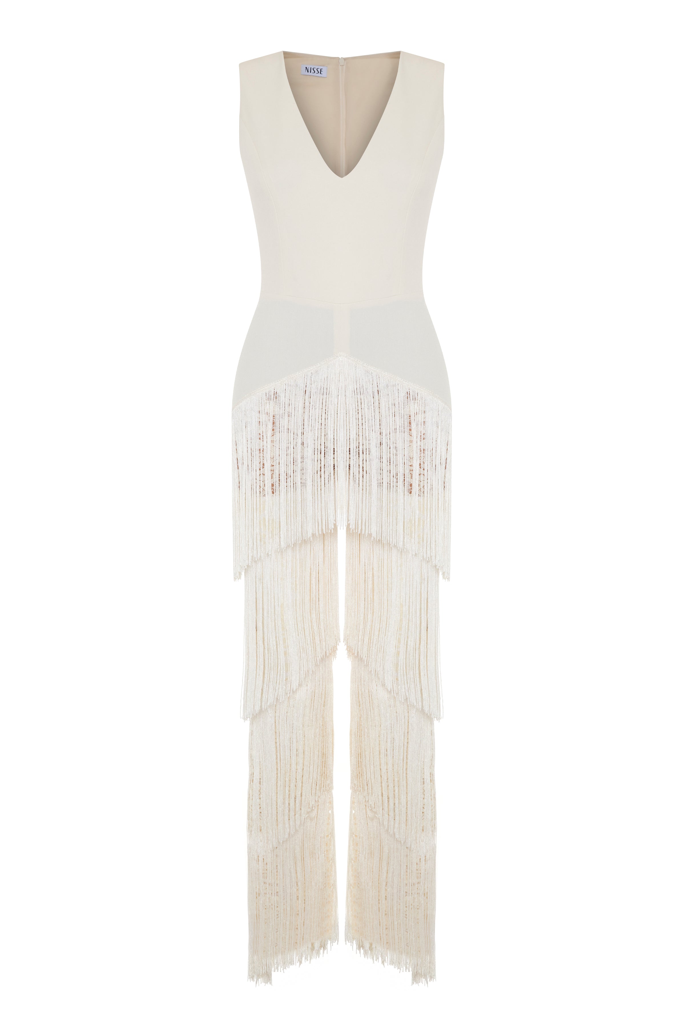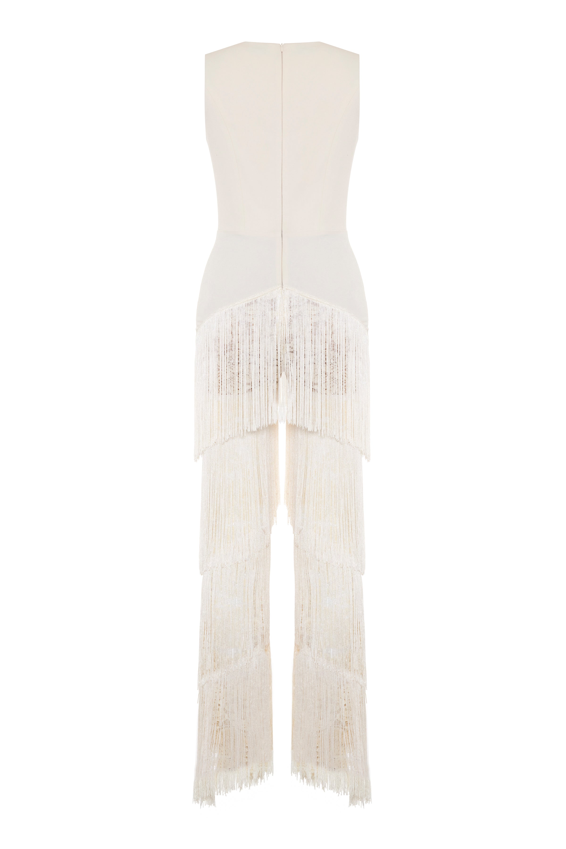 This trendy patchwork jumpsuit is crafted from tassels and lace, and boasts a deep V-neck. It combines different textures for a bold and stylish look.