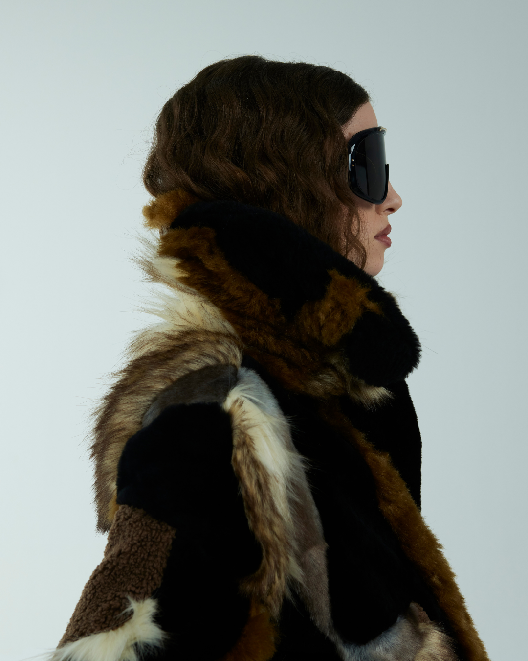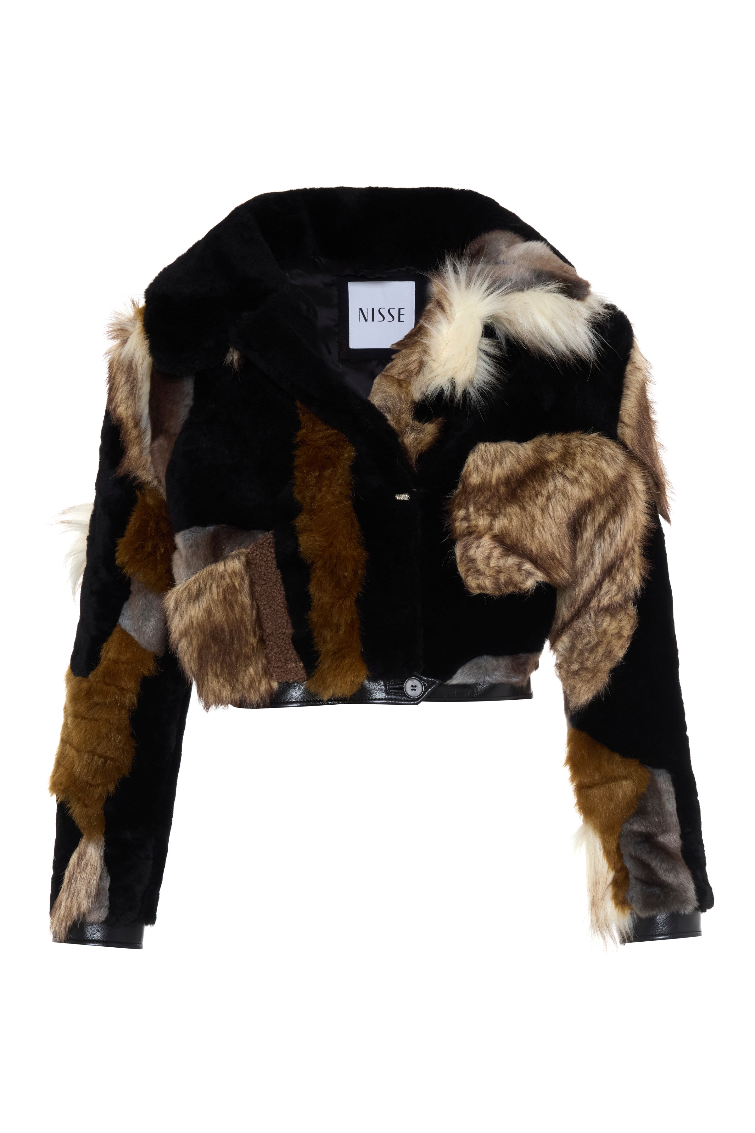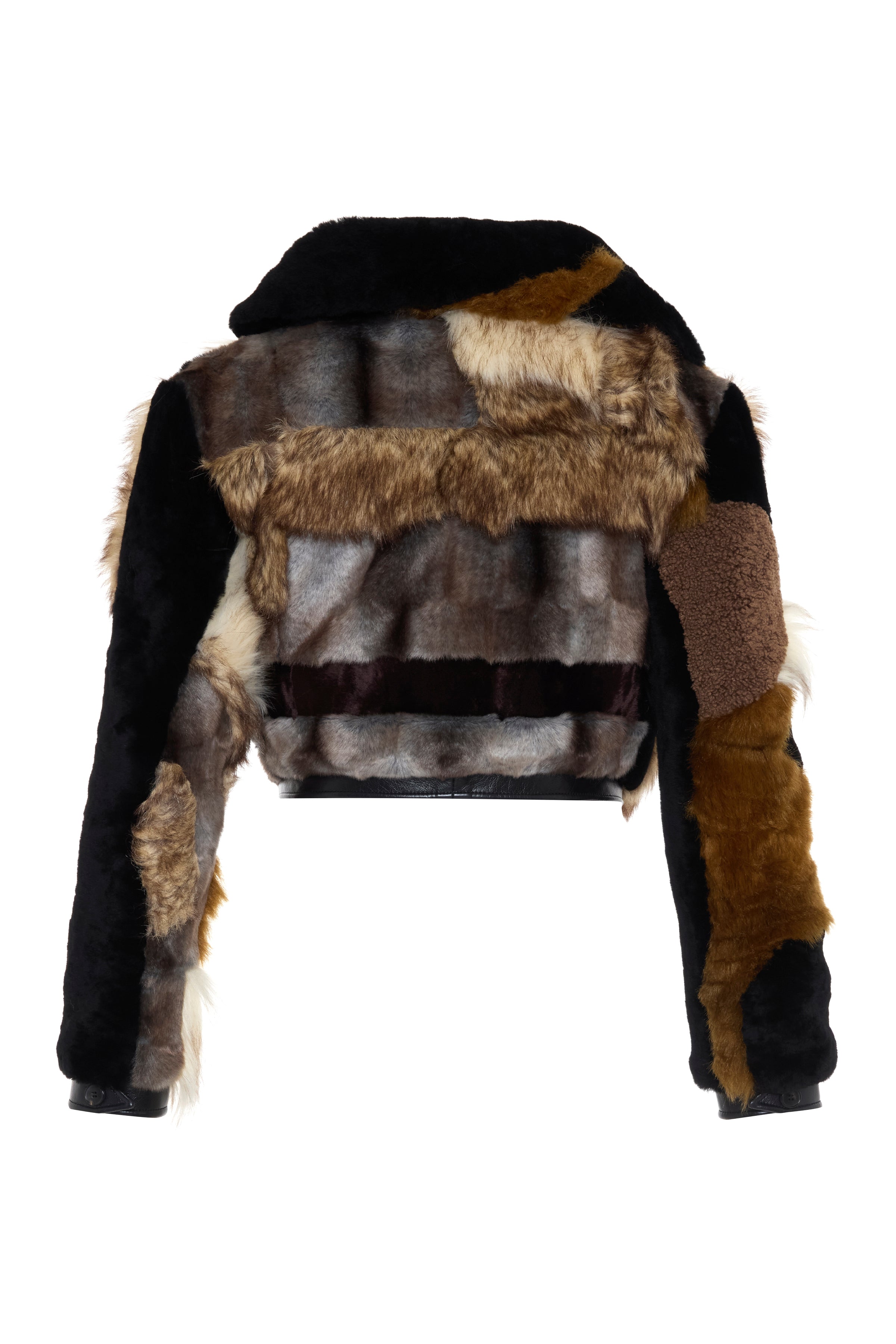 This updated fur bomber jacket combines playful texture with a modern and feminine style, with its bold patchwork design, leather details and short silhouette.