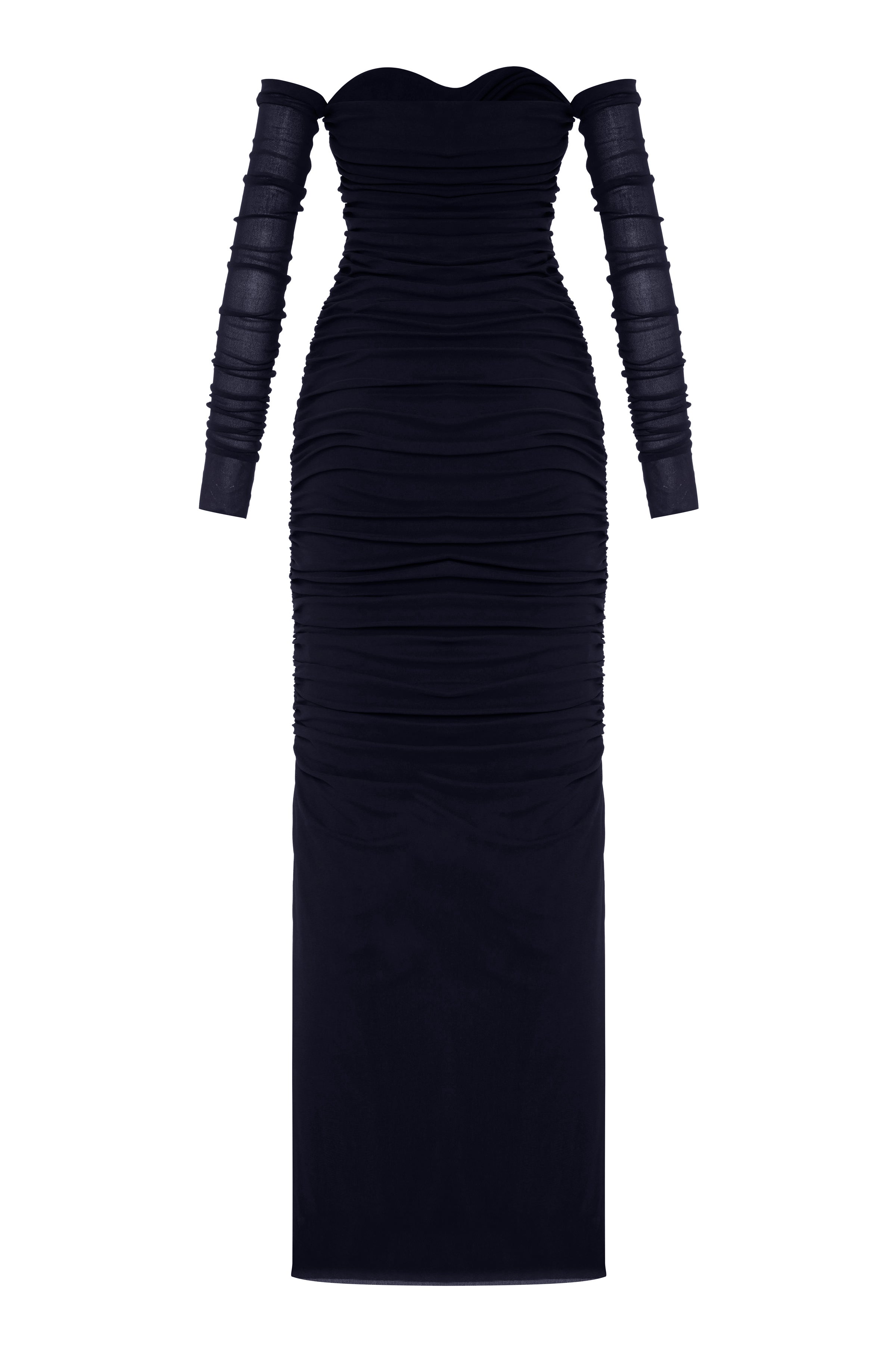 This long, draped dress in stretch tulle fabric features detachable sleeves and a bold and eye-catching side zipper detail that extends from top to bottom, adding a bold and rebellious touch to the design.