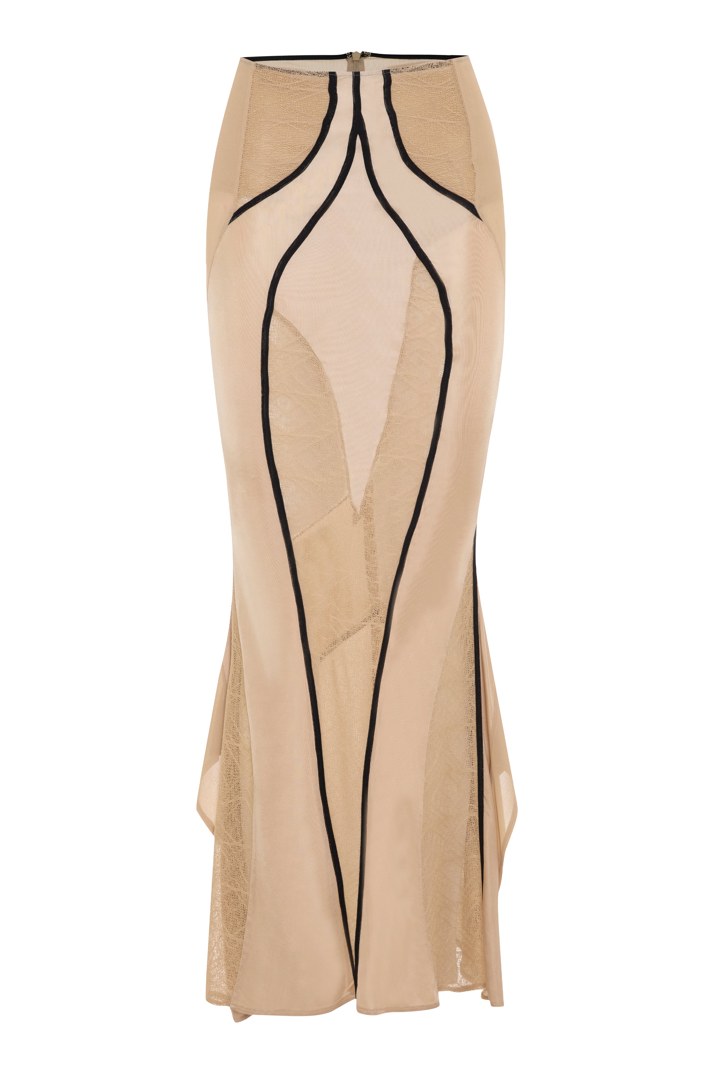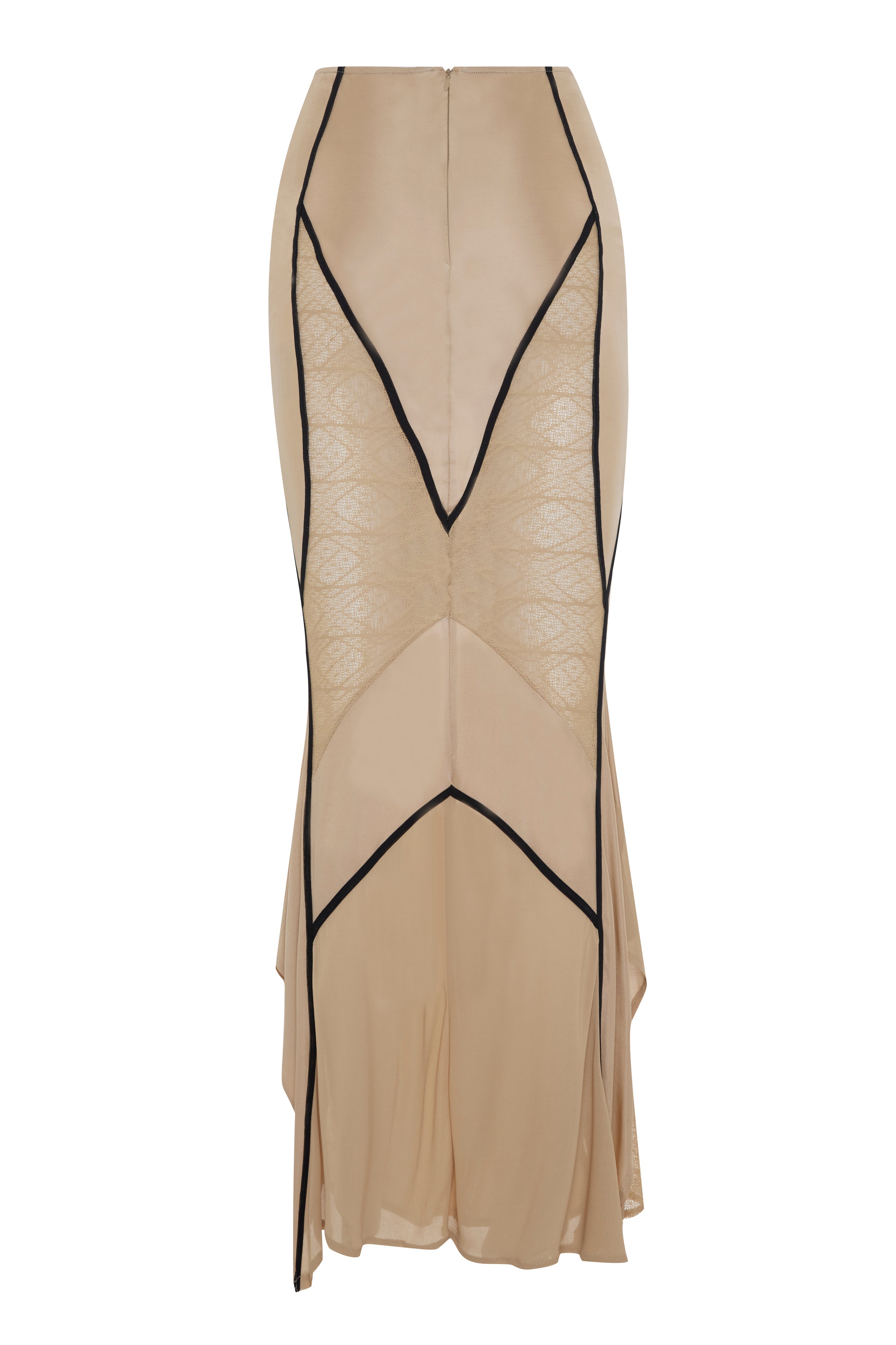 The strapless draped top draws attention with its bustier-inspired bodice, creating a distinctive geometric neckline and highlighting the alluring silhouette.