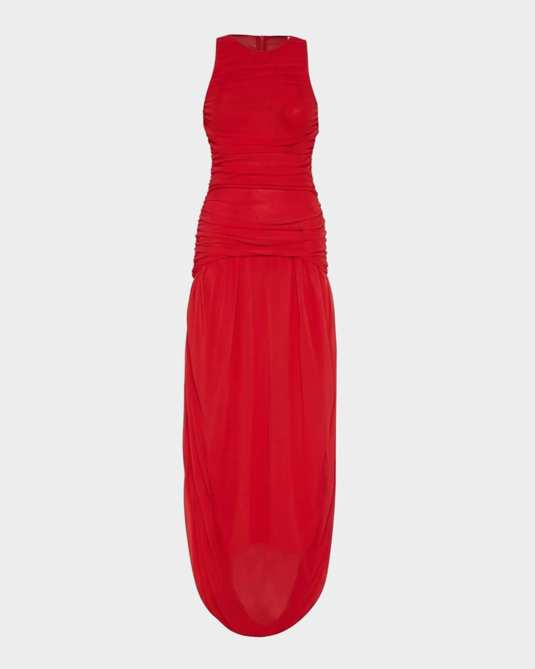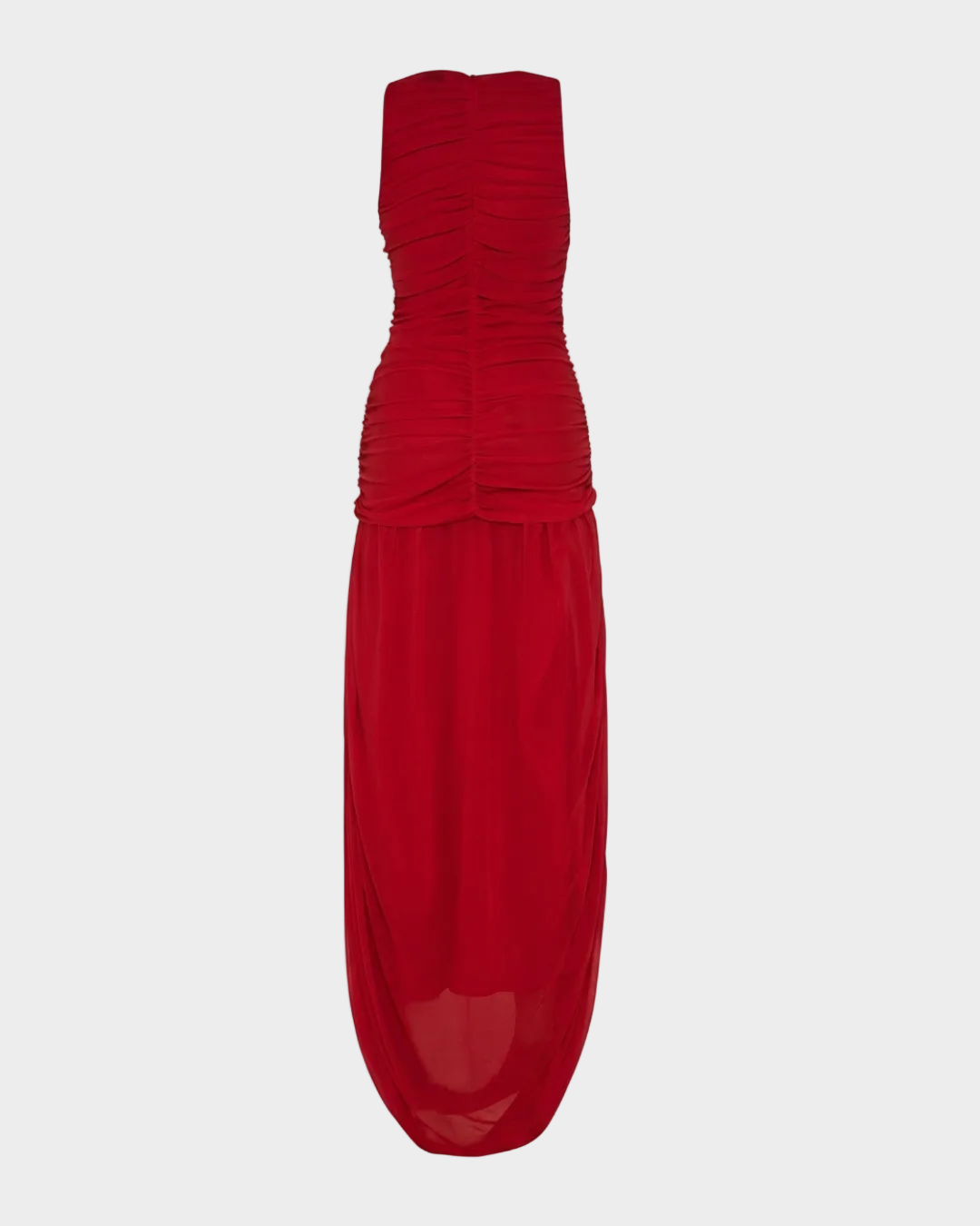 En kaliteli İtalyan tülünden üretilen bu elbise, yüksek yakası ve vücuda zarifçe oturan silüetiyle dikkat çeker. Yumuşak drapeler, hafif balon formunda bir etek ucuna doğru akarak tasarımın zamansız zarafetini sanatsal bir dokunuşla tamamlar.