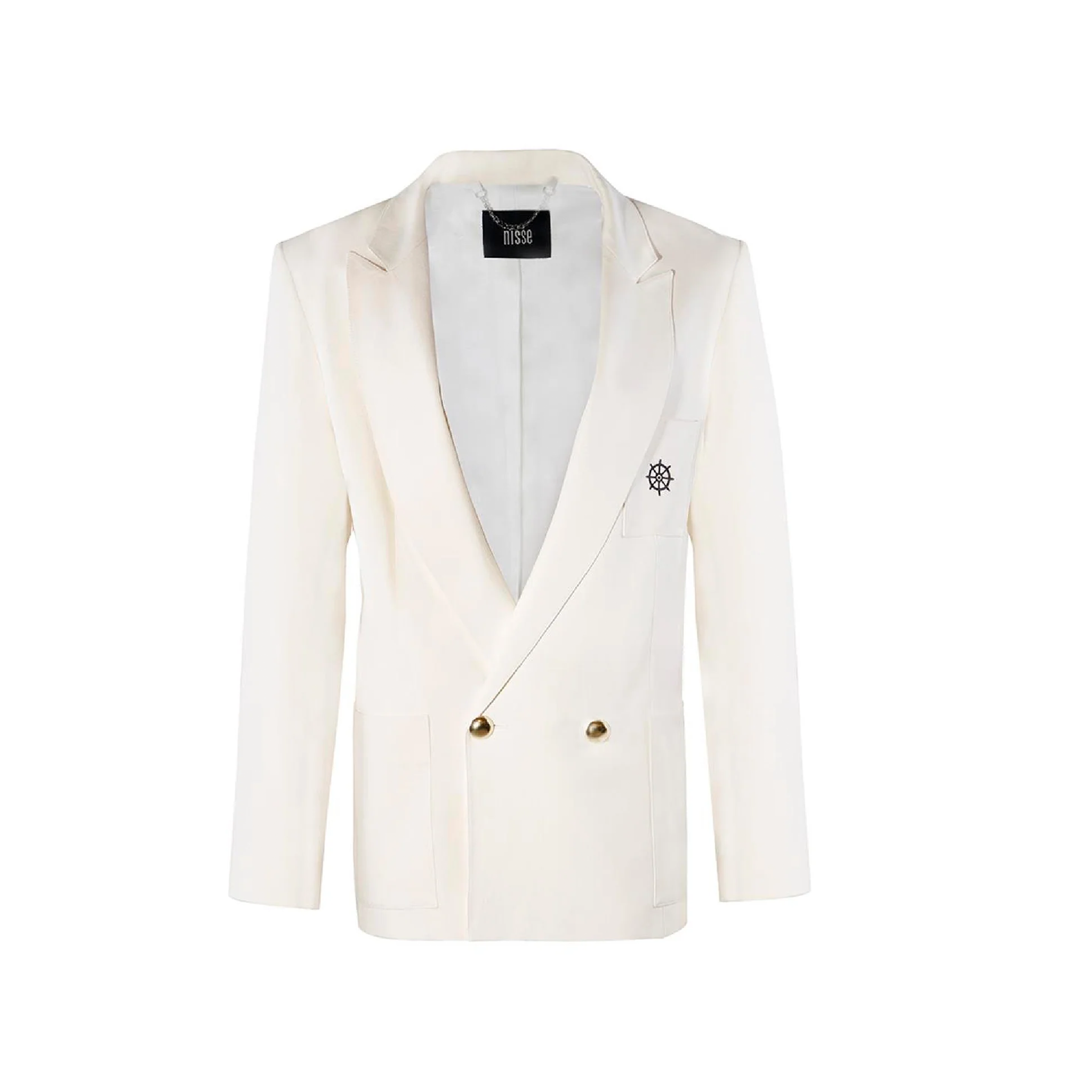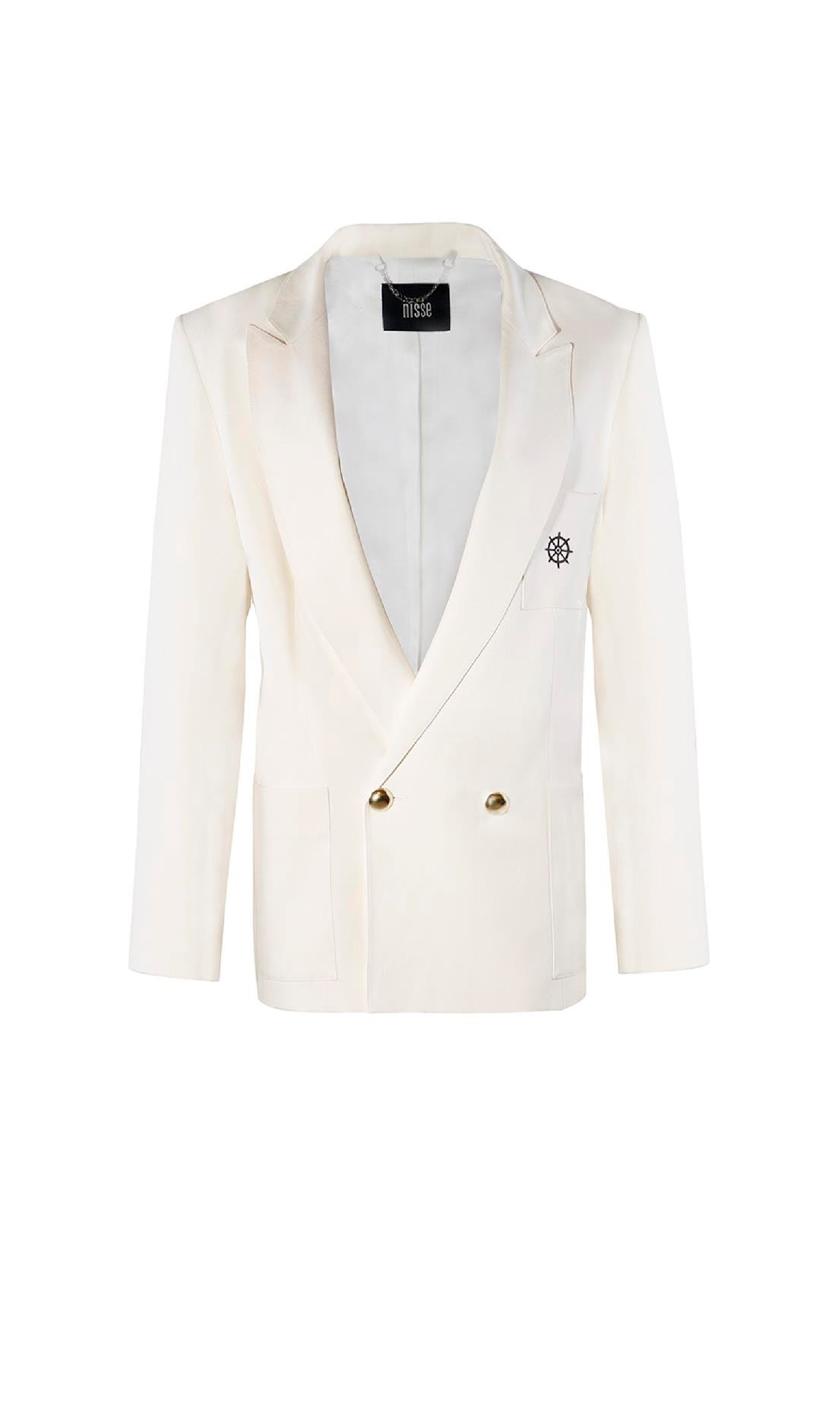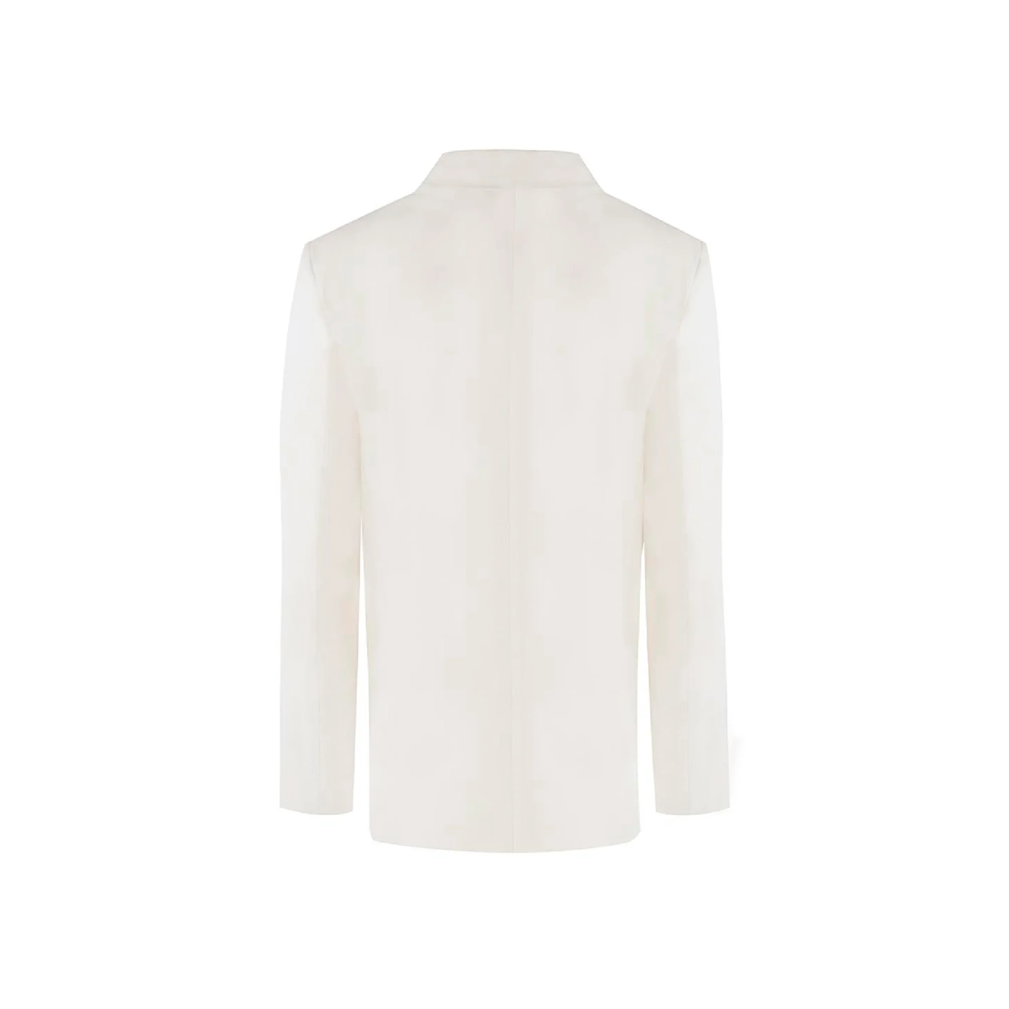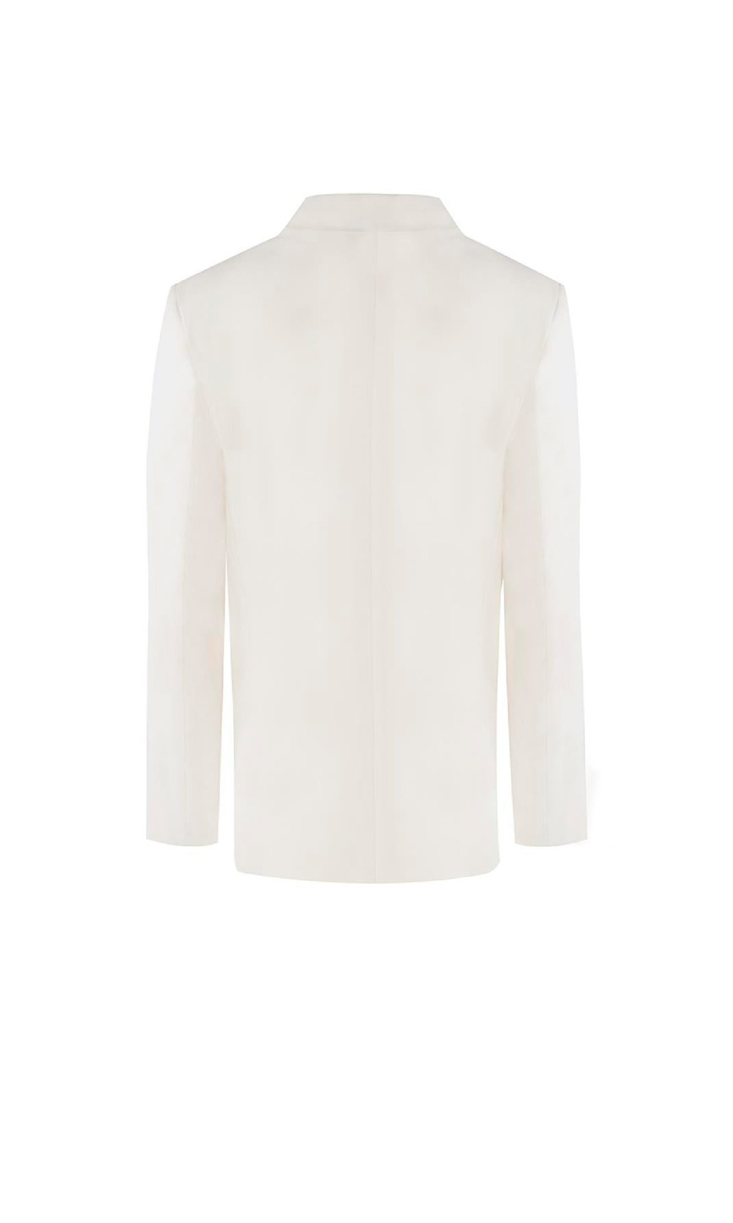 The Louise Jacket, made of 50% lyocell, 28% linen, 21% cotton, and 1% elastane, offers a lightweight, breathable, and fluid feel, while its lining is 100% viscose. Its oversized white cut, double gold button details, and delicately embroidered ruffle shoulder line transform timeless feminine elegance into architectural elegance.
