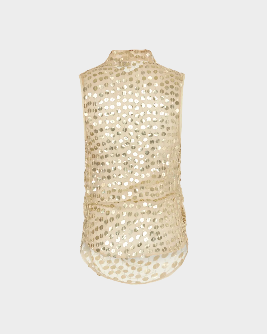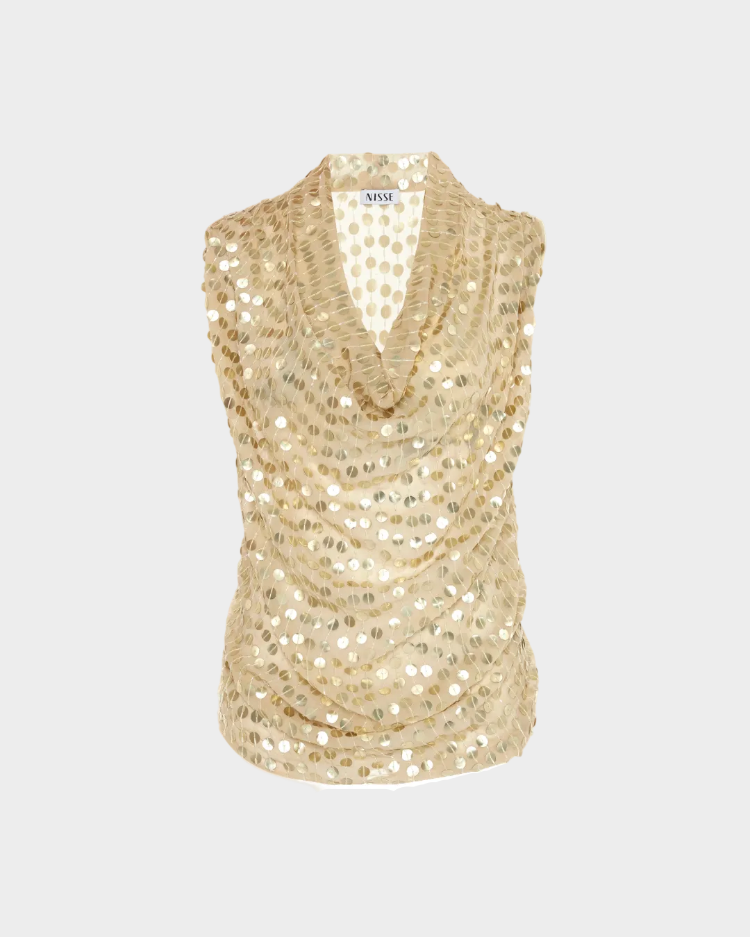 Ön kısmında dégagé yakaya ve akıcı drapelere sahip ipek bluz; elde işlenmiş payet detaylarıyla tamamlanmış, zarafeti modern bir incelikle dengeleyen çok yönlü bir statement parçadır.