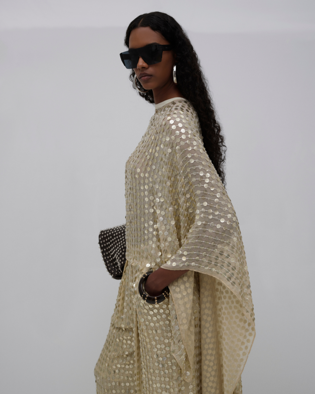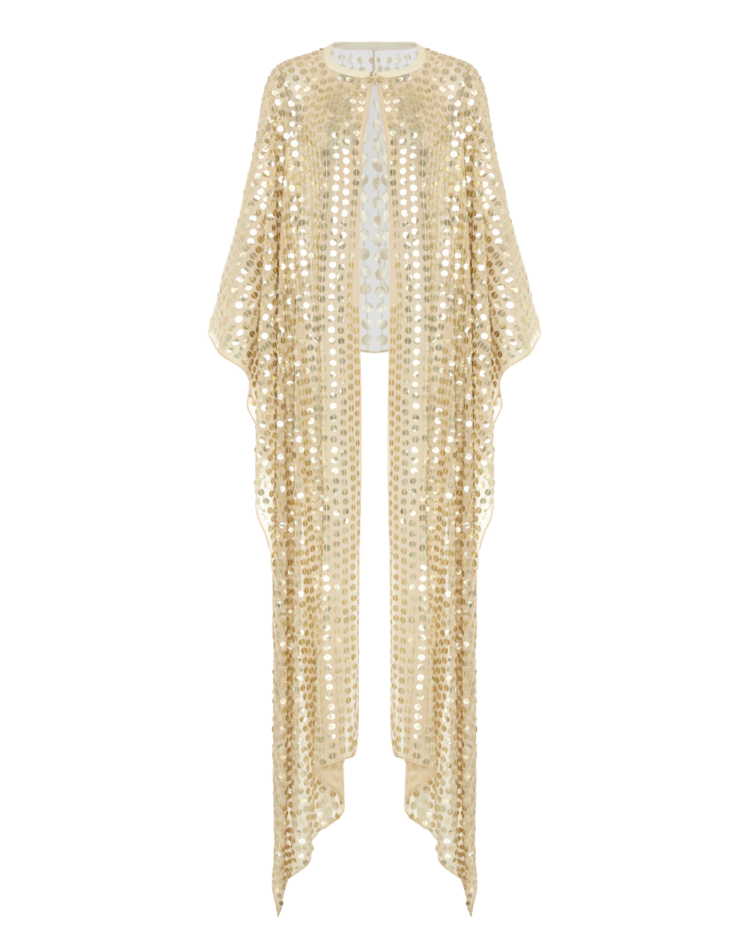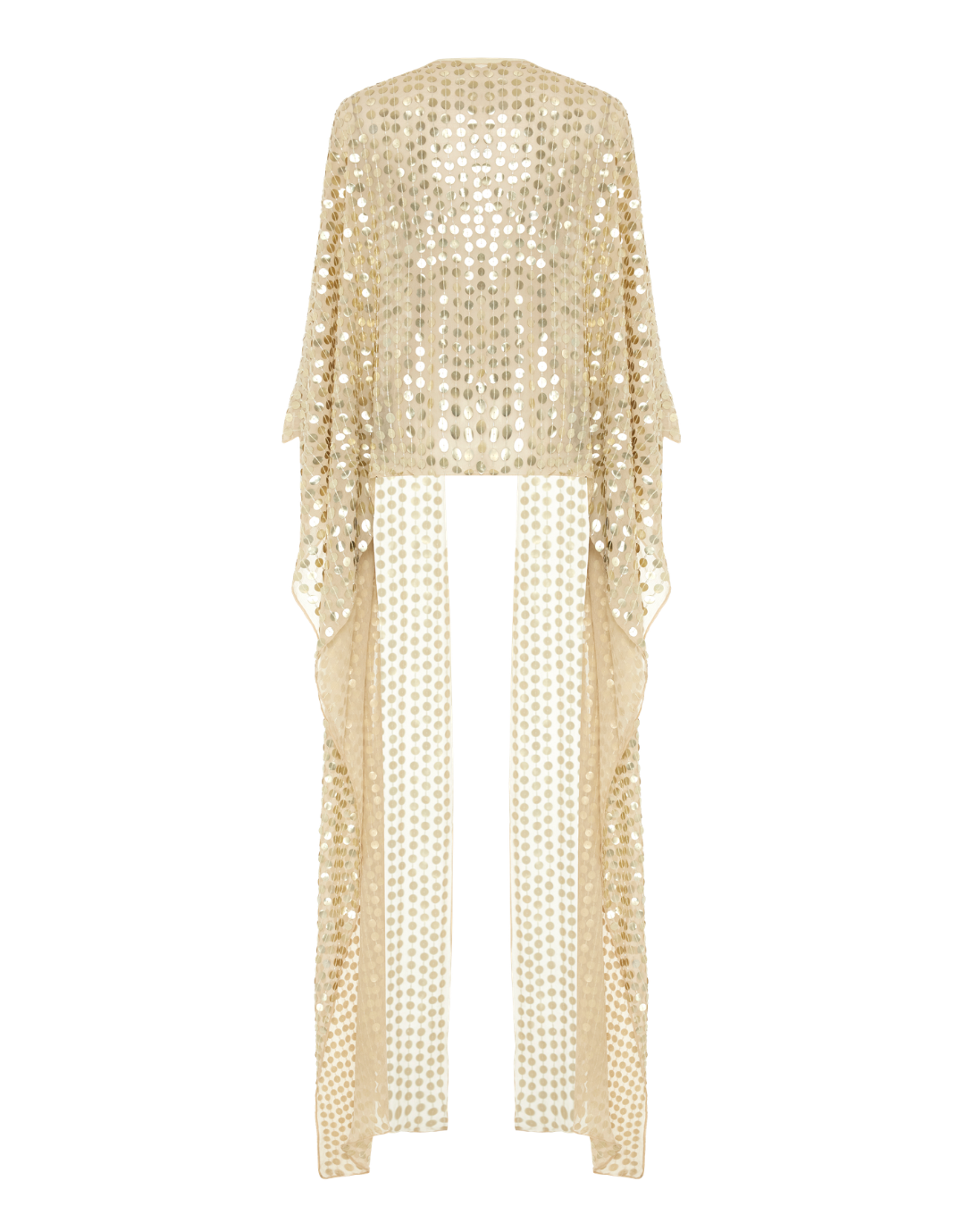 Payetlerle süslenmiş ipek pelerin; önde kısa, arkada uzun kesimiyle çok yönlü stil kullanımına imkân tanır.