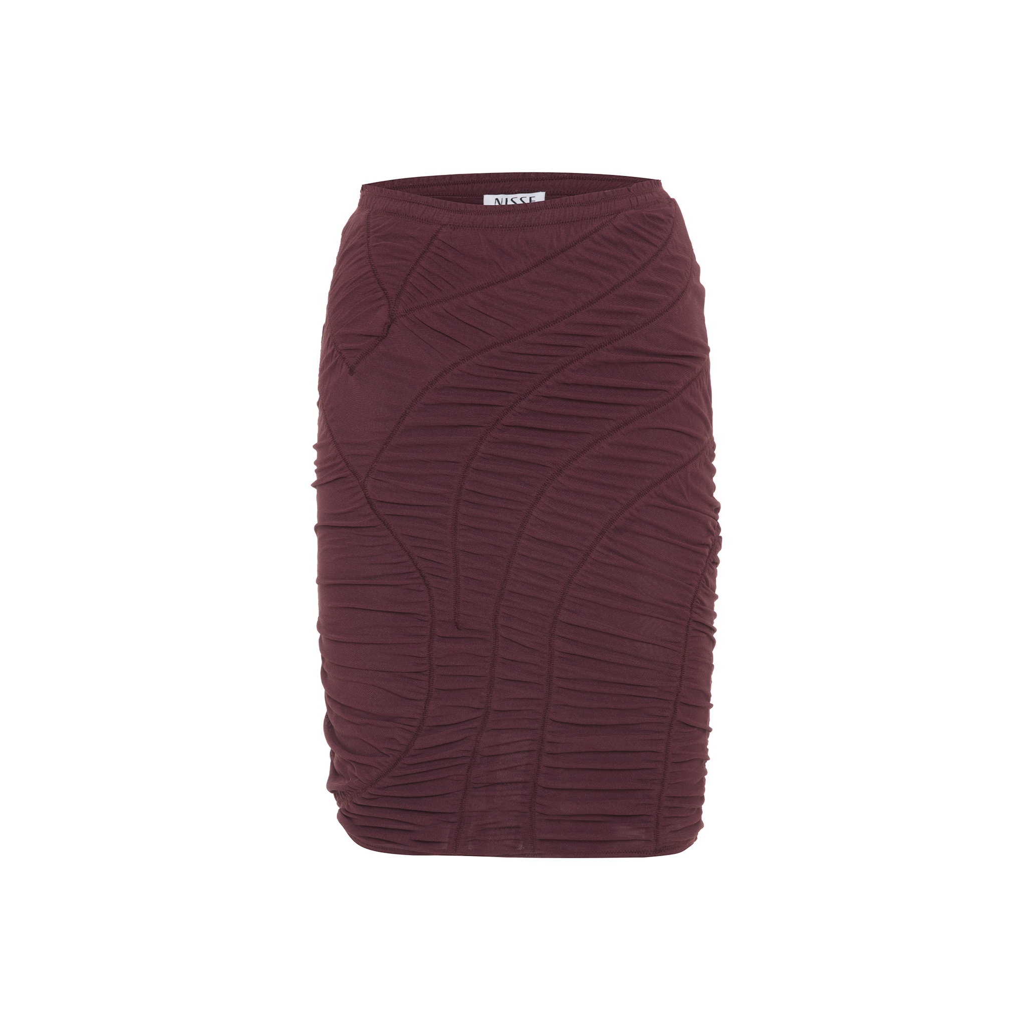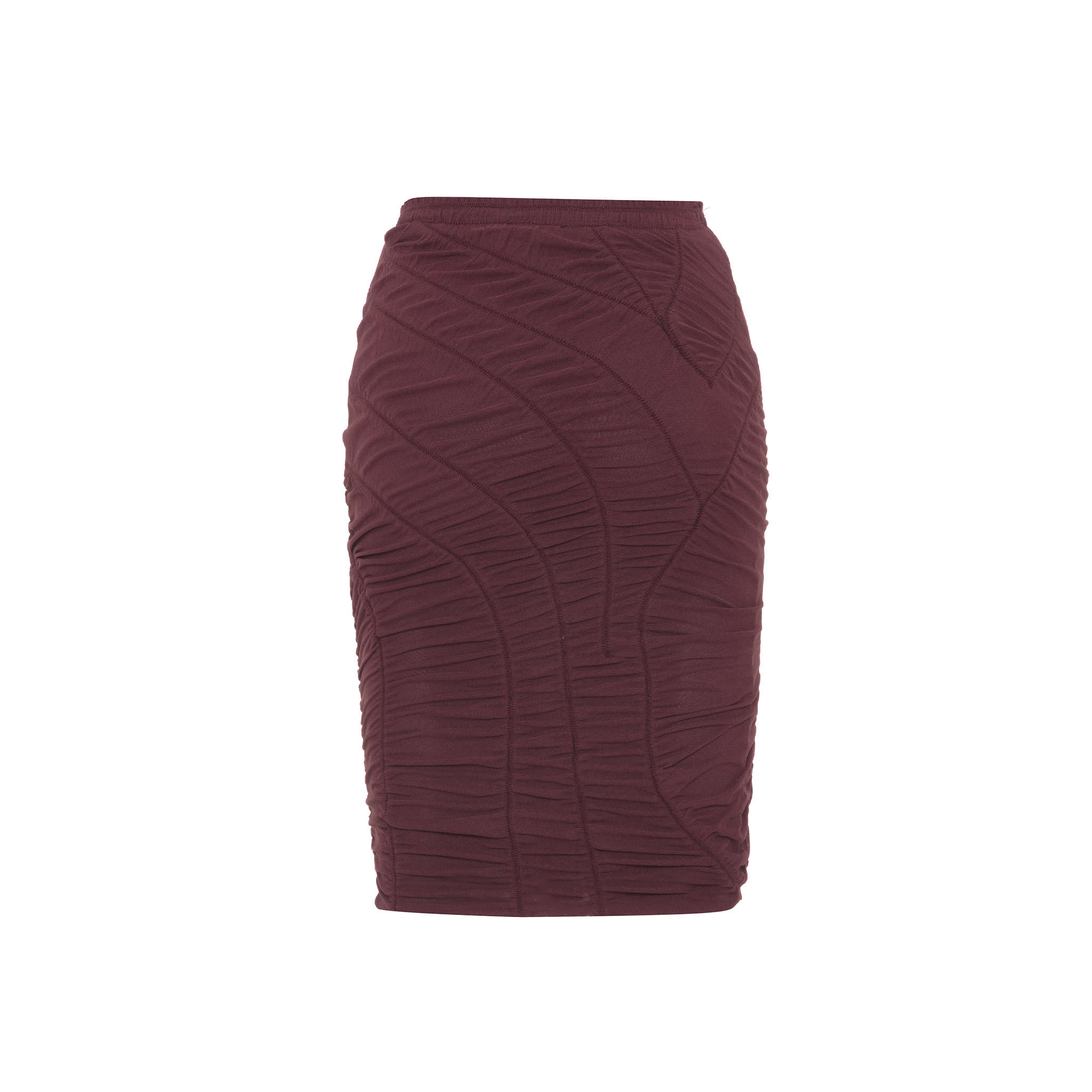 This fitted midi skirt features a gathered design with subtle patterned seams that add movement throughout.