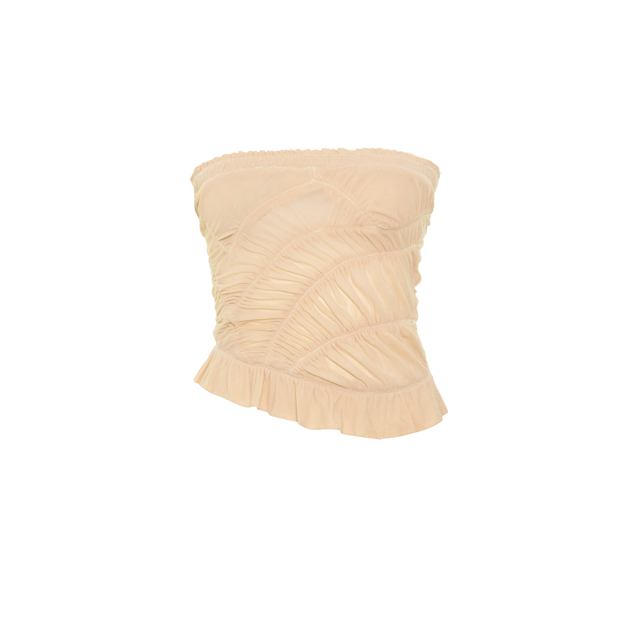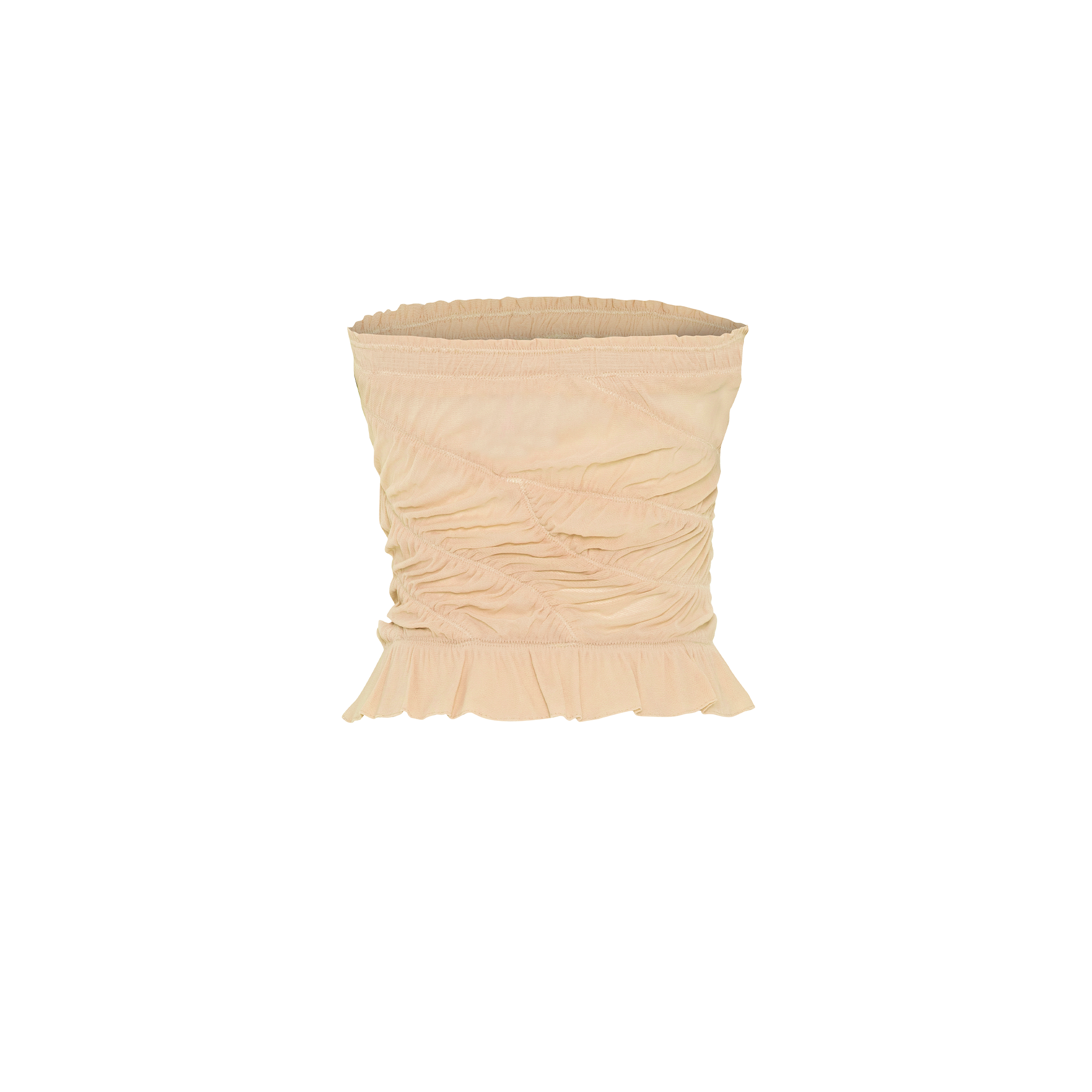 Crafted from fine Italian knit tulle, this strapless top elevates your look with patterned stitching that creates a subtle gather effect across the entire surface. It pairs perfectly with the matching skirt.