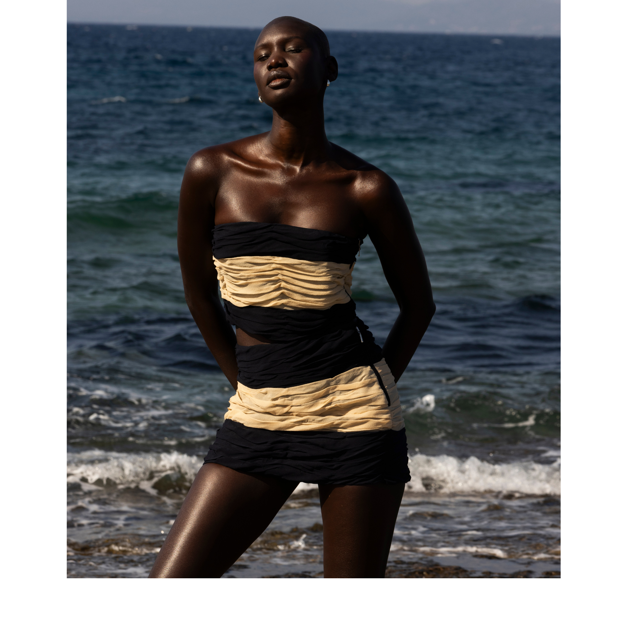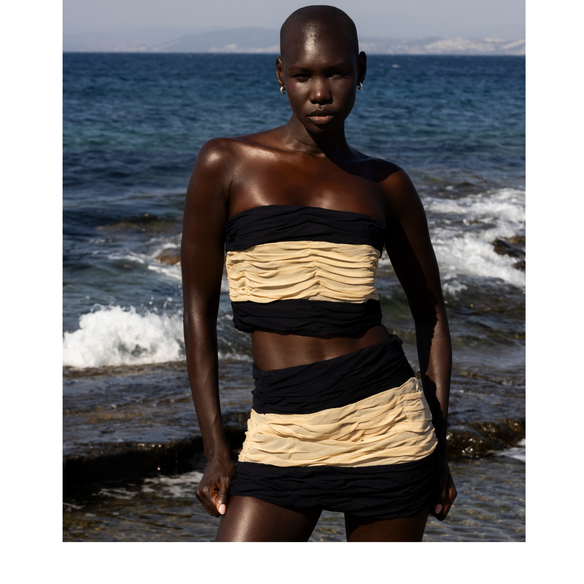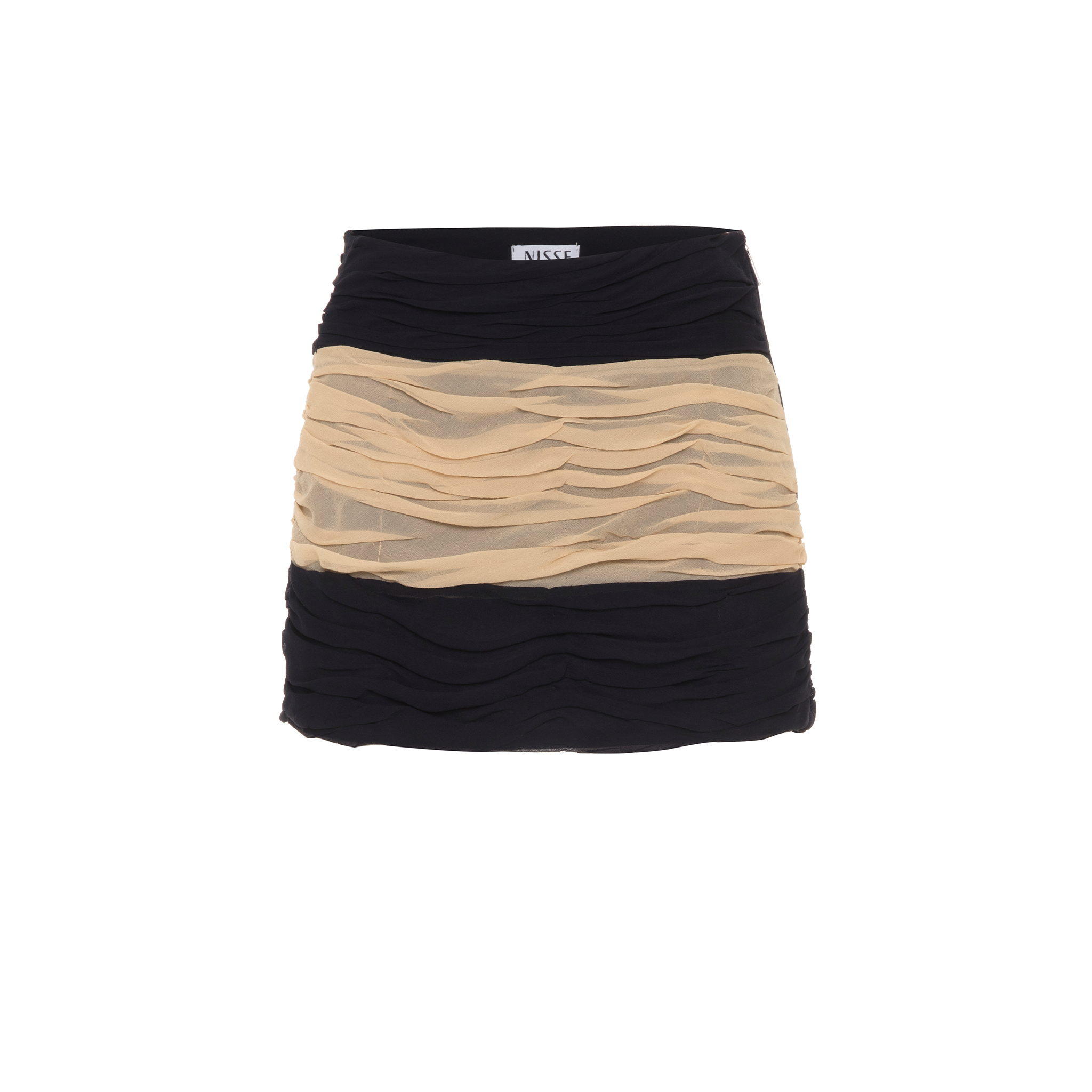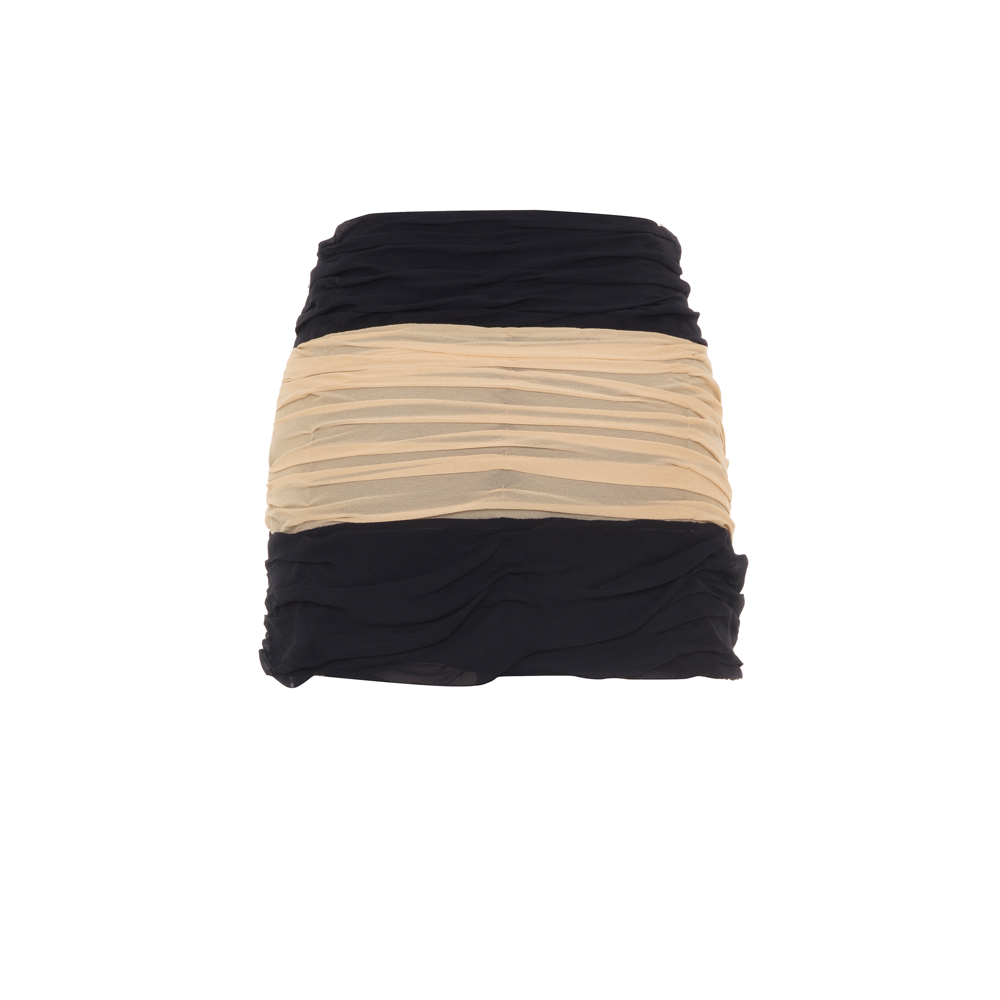 Crafted from elegant silk fabric with a pleated texture, this mini skirt is designed to pair perfectly with the matching strapless crop top.
