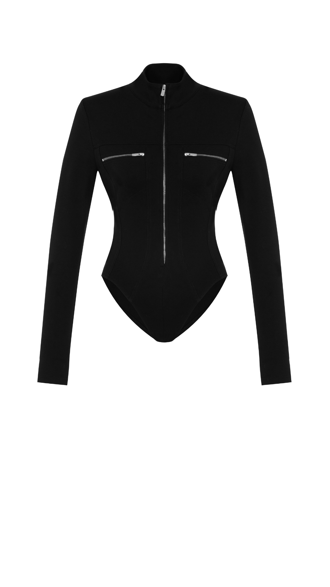 The strapless draped top draws attention with its bustier-inspired bodice, creating a distinctive geometric neckline and highlighting the alluring silhouette.