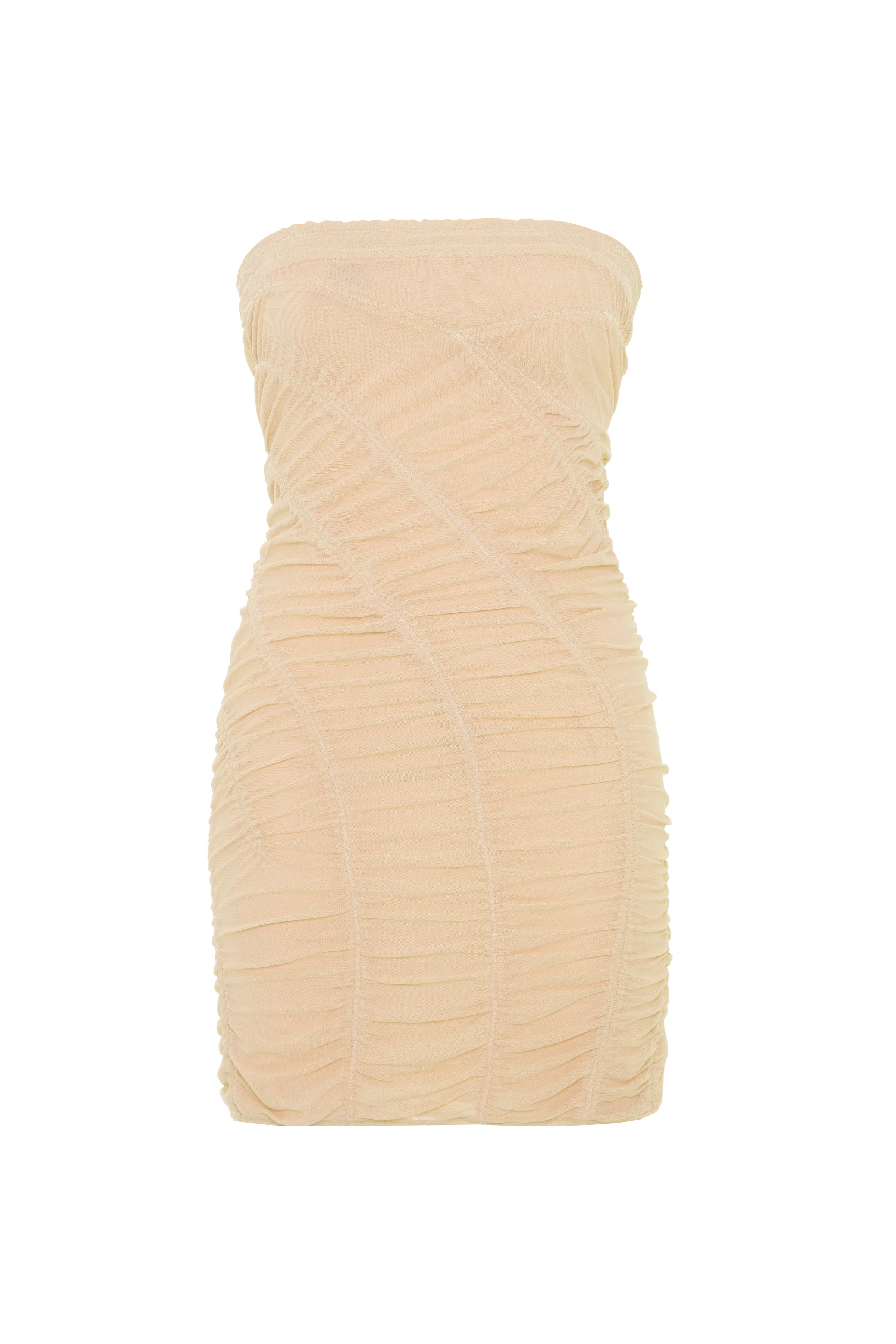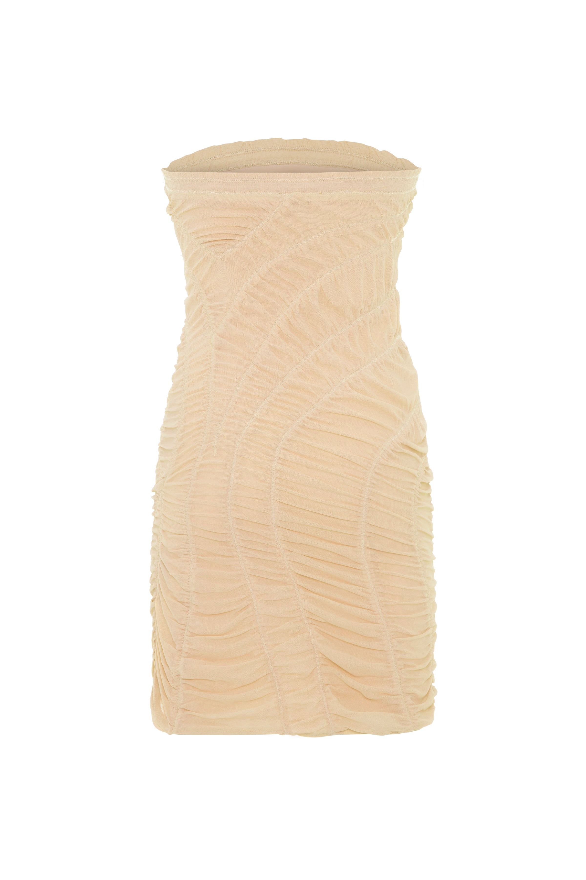 This fitted, strapless mini dress is crafted from fine Italian-made tulle. Delicately patterned stitching creates a striking gather detail throughout. Perfect for effortlessly transitioning from daytime chic to evening elegance.