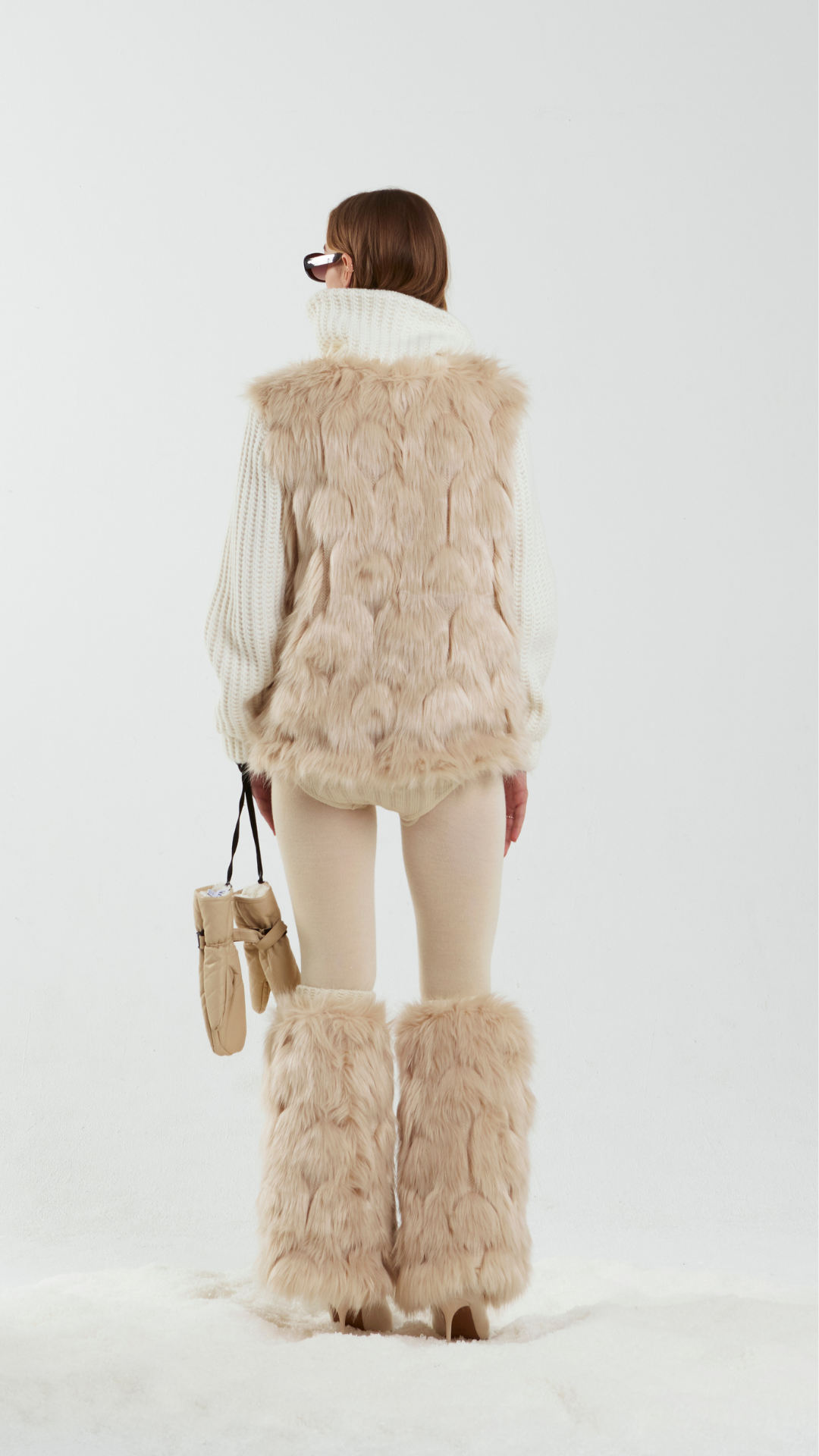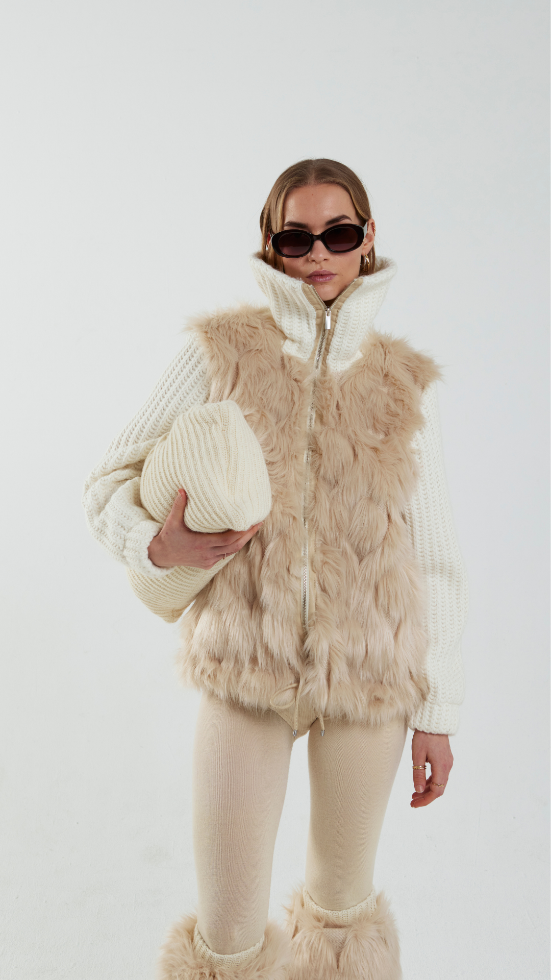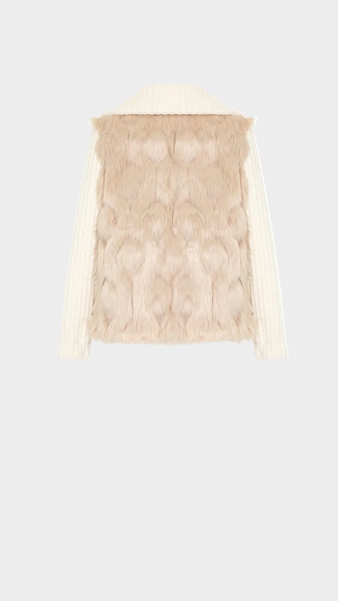 Örgü kollara ve eko-kürk gövdeye sahip ceket, yumuşak triko dokusuyla lüks yapay kürkü bir araya getirerek şık ve çok yönlü bir görünüm sunar. Hem sıcak tutan hem de stil sahibi bir seçenek olarak öne çıkar.