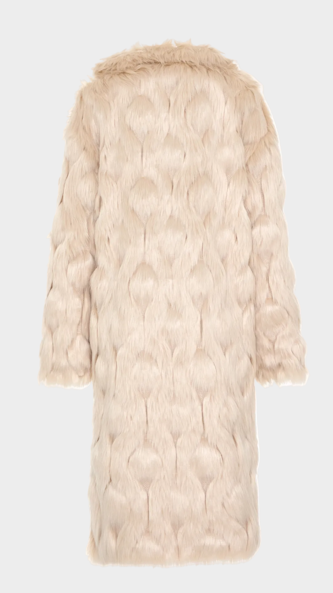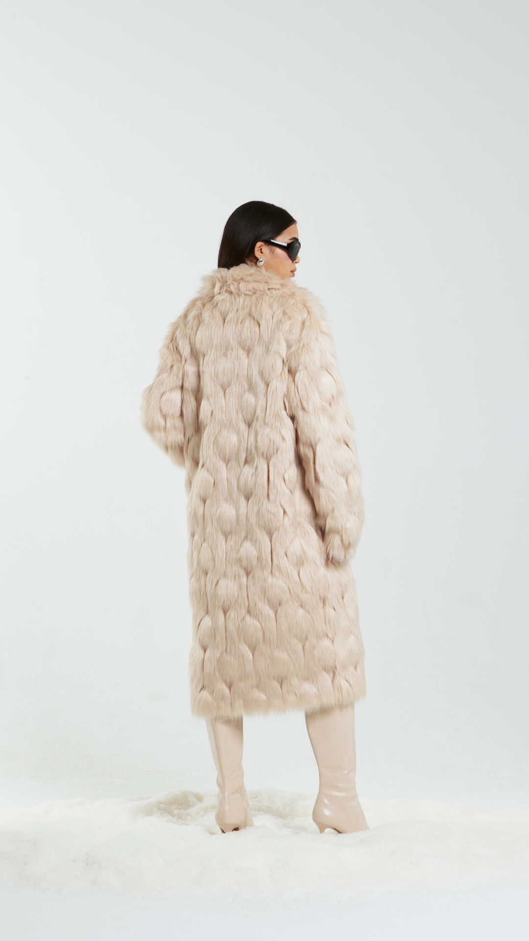 Yaka detayına sahip uzun kürk kaban, kürkün yün bir taban üzerine özenle yerleştirildiği benzersiz tasarımıyla dikkat çeker. İç kısımdaki esnek astar konfor ve hareket özgürlüğü sağlayarak lüks ve sıcaklığı mükemmel bir şekilde dengeler.