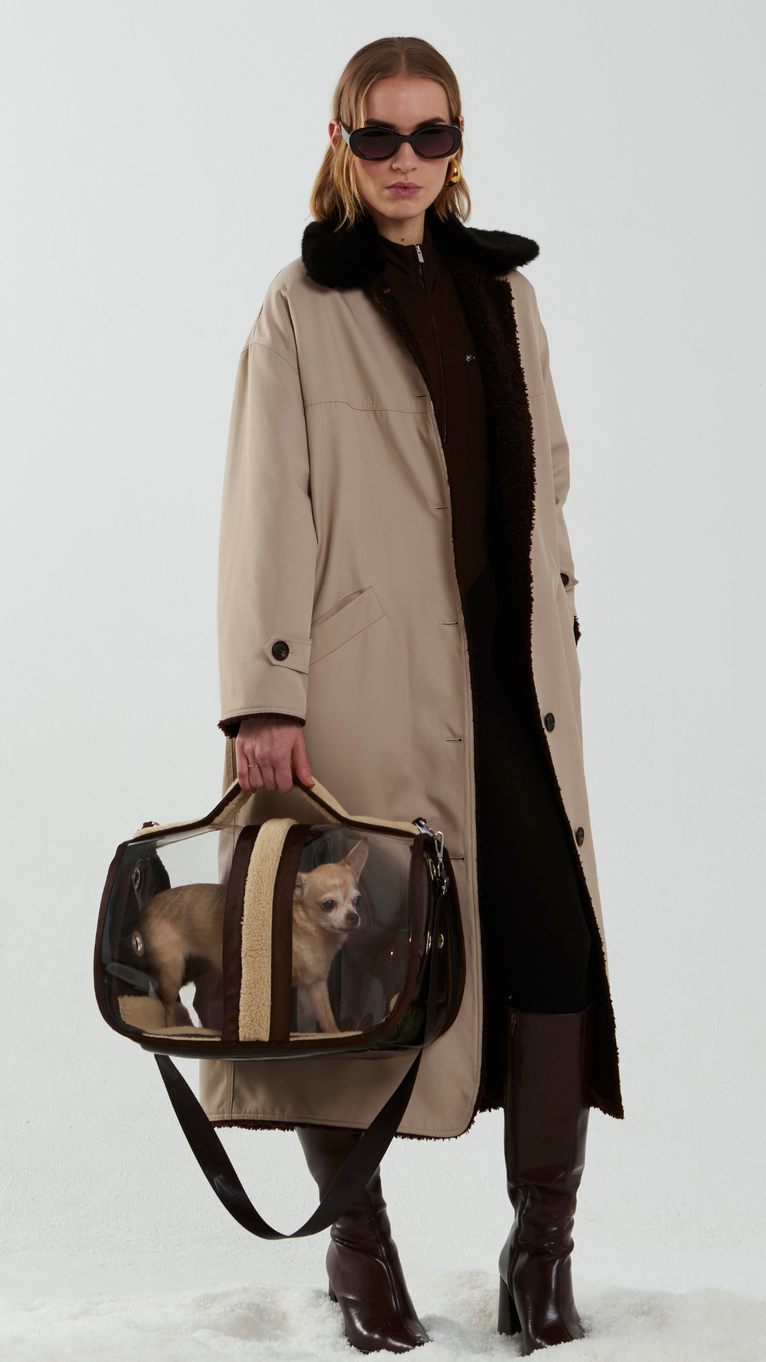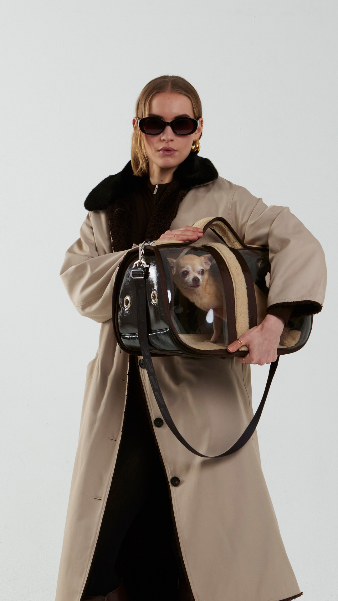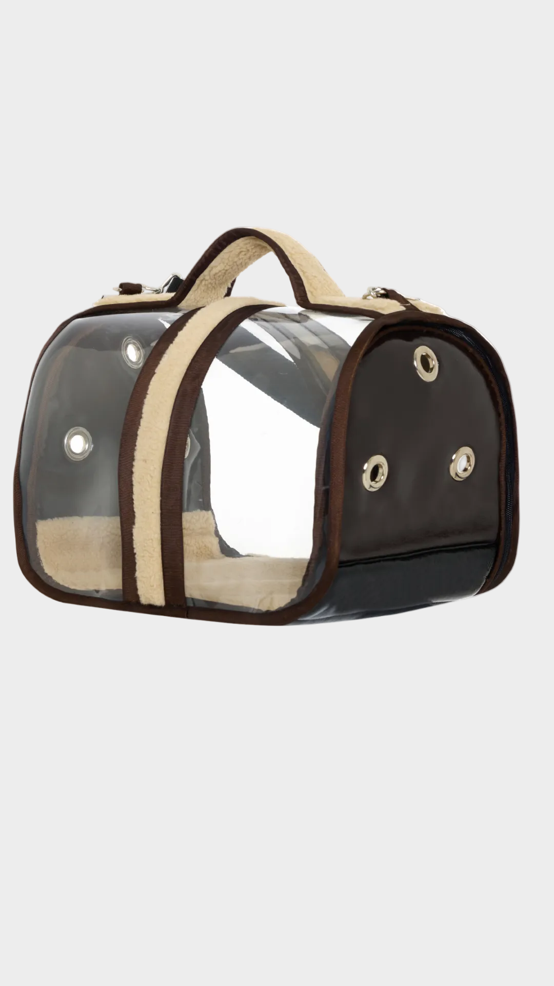 Sert ve şeffaf yapısıyla elde taşınabilir boyutta tasarlanmış bu köpek taşıma çantası, konfor için şerling kaplı bir tabana sahiptir. Çıkarılabilir omuz askısı ve elde taşıma sapıyla hem şık hem de son derece pratiktir. Hava yolculukları için ideal ve modern bir seyahat aksesuarıdır.