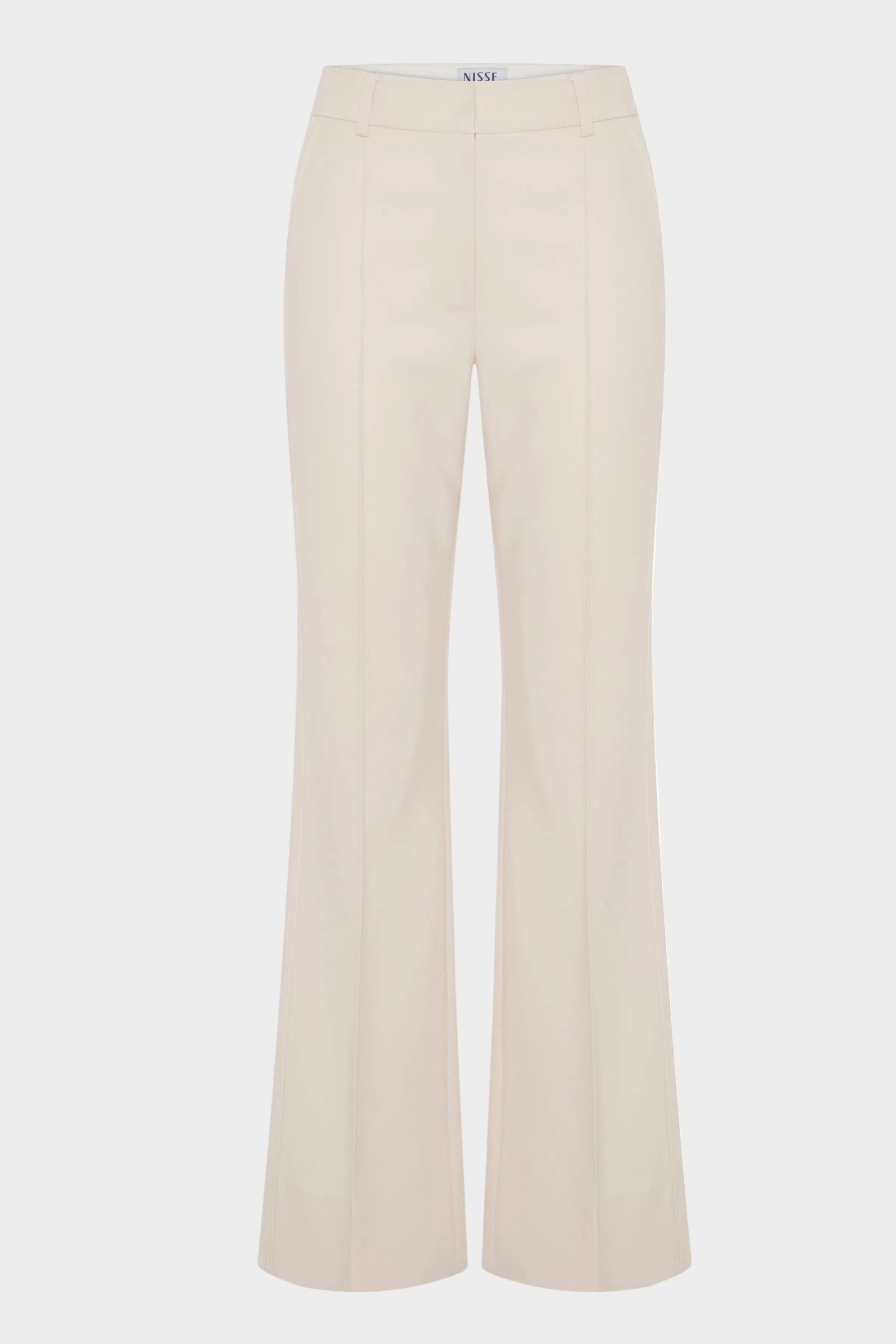 Yüksek bel ve geniş paça kesimiyle tasarlanan bu krem pantolon, vücut hatlarını zarifçe vurgulayan ve zamansız bir siluet sunar.