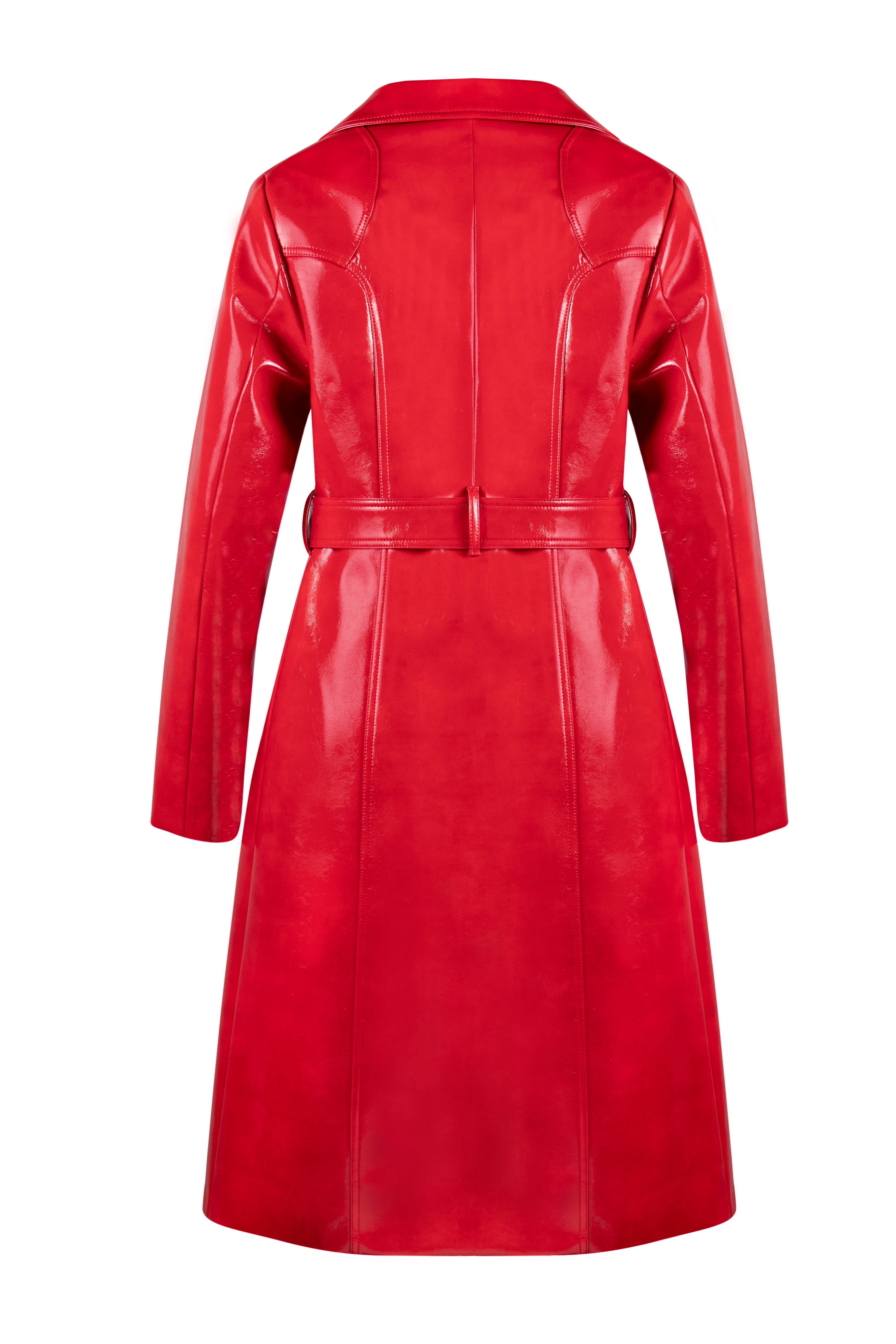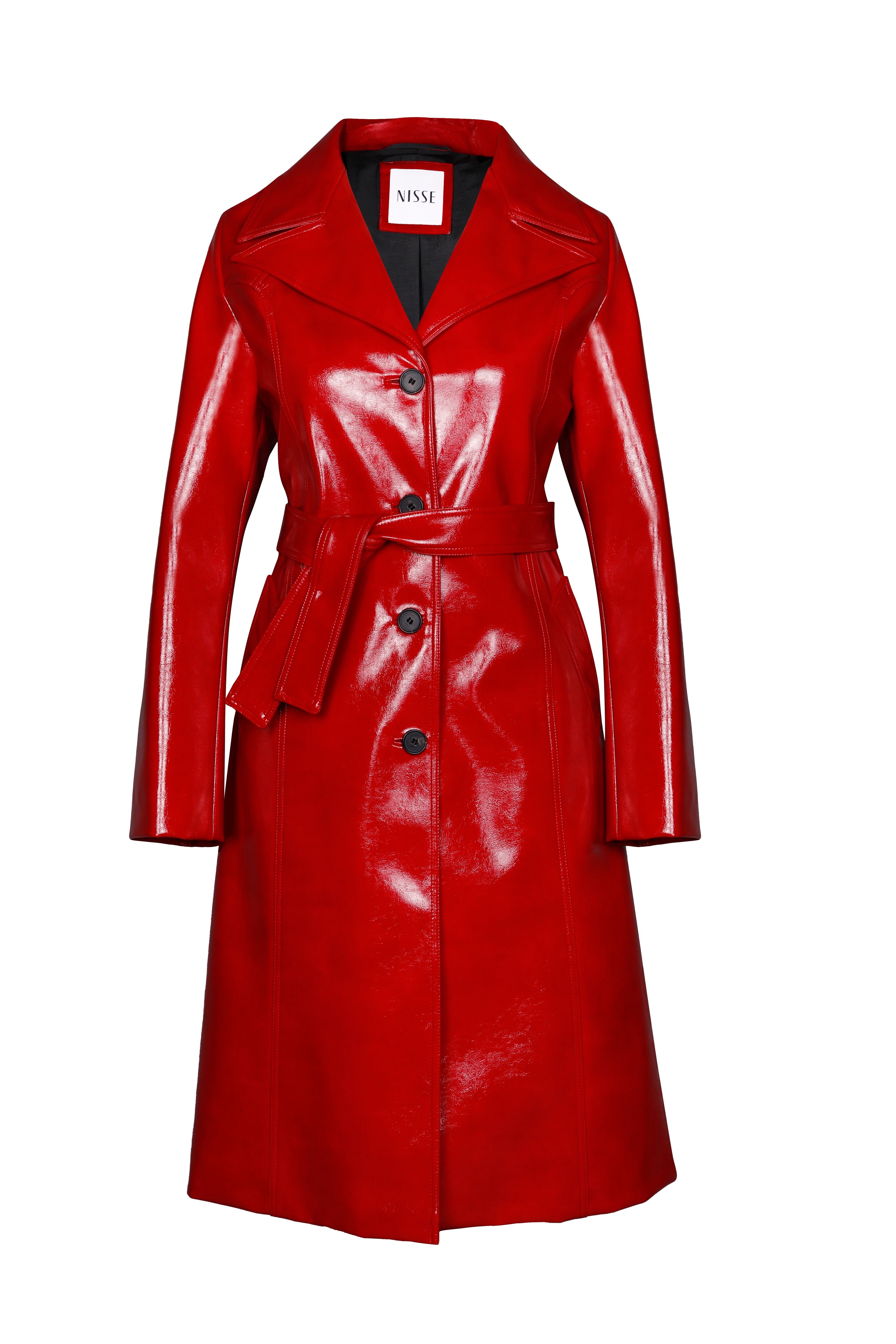 Klasik trençkota, cesur bir dış giyim parçası olarak iddialı bir duruş sunan canlı kırmızı vinil kaplamalı bitişle farklı bir dokunuş kattık.