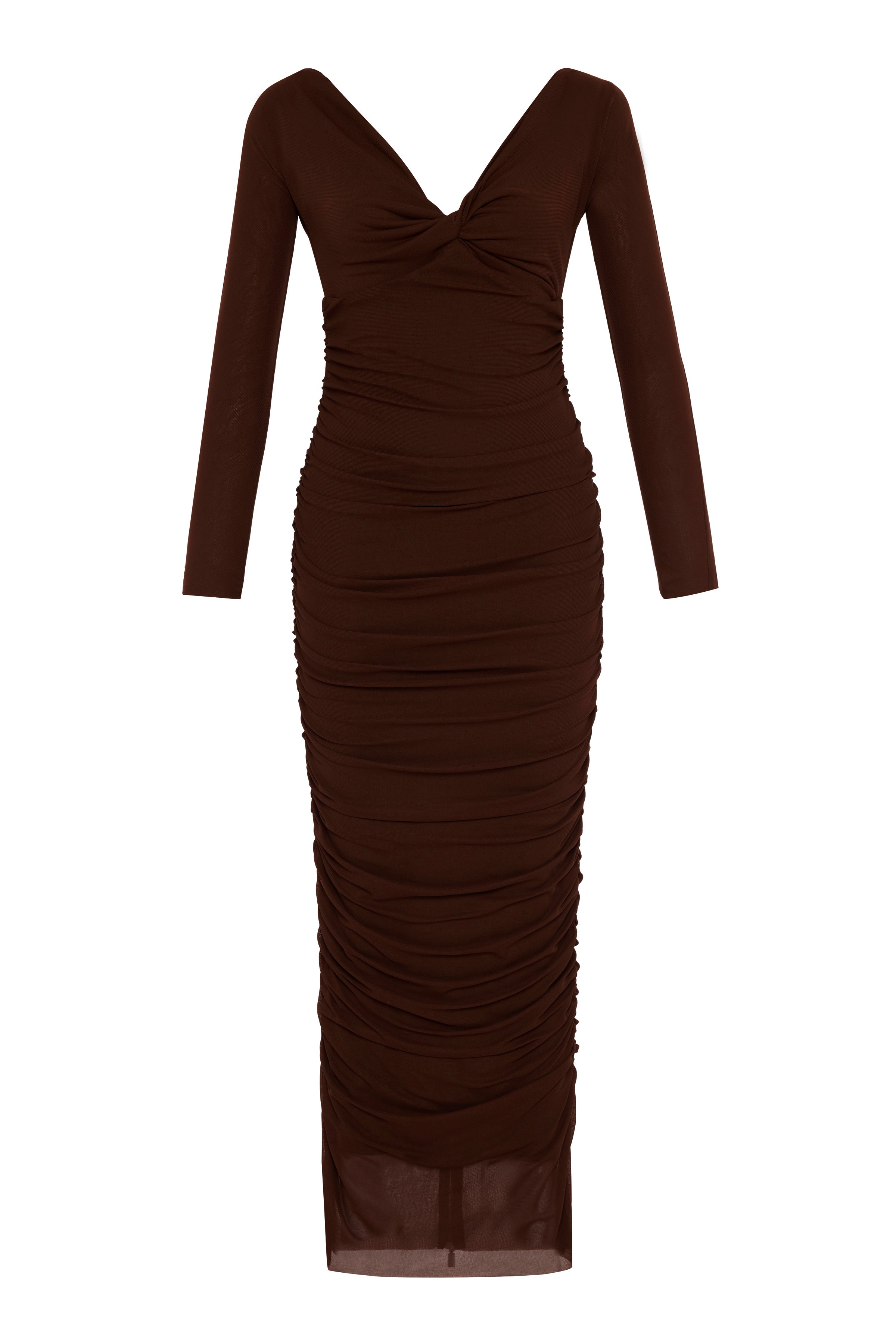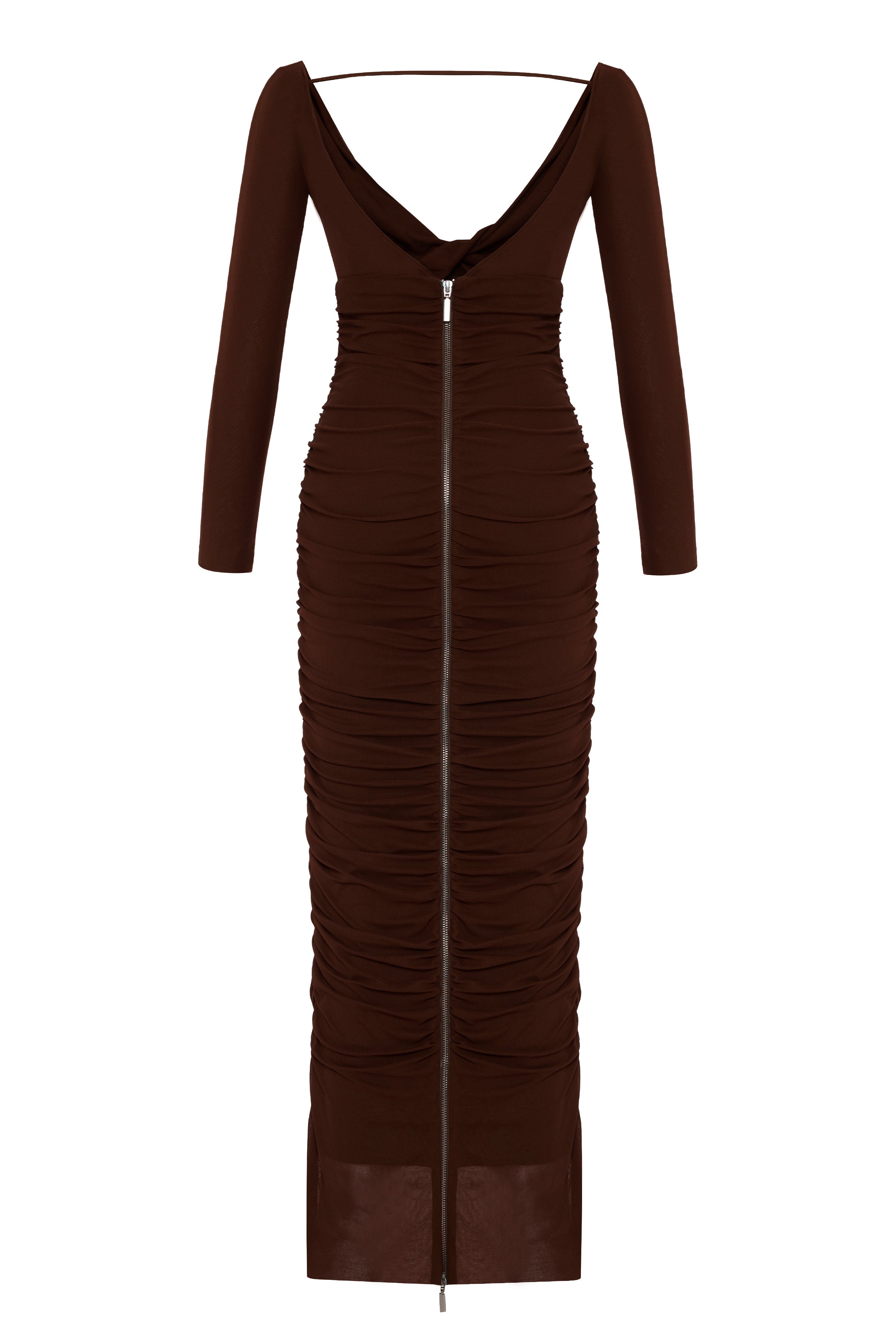 Cesur derin V yaka detayına sahip uzun, streç tül drapeli elbise; baştan aşağı uzanan arka fermuarıyla çarpıcı ve baştan çıkarıcı bir silüet yaratıyor.