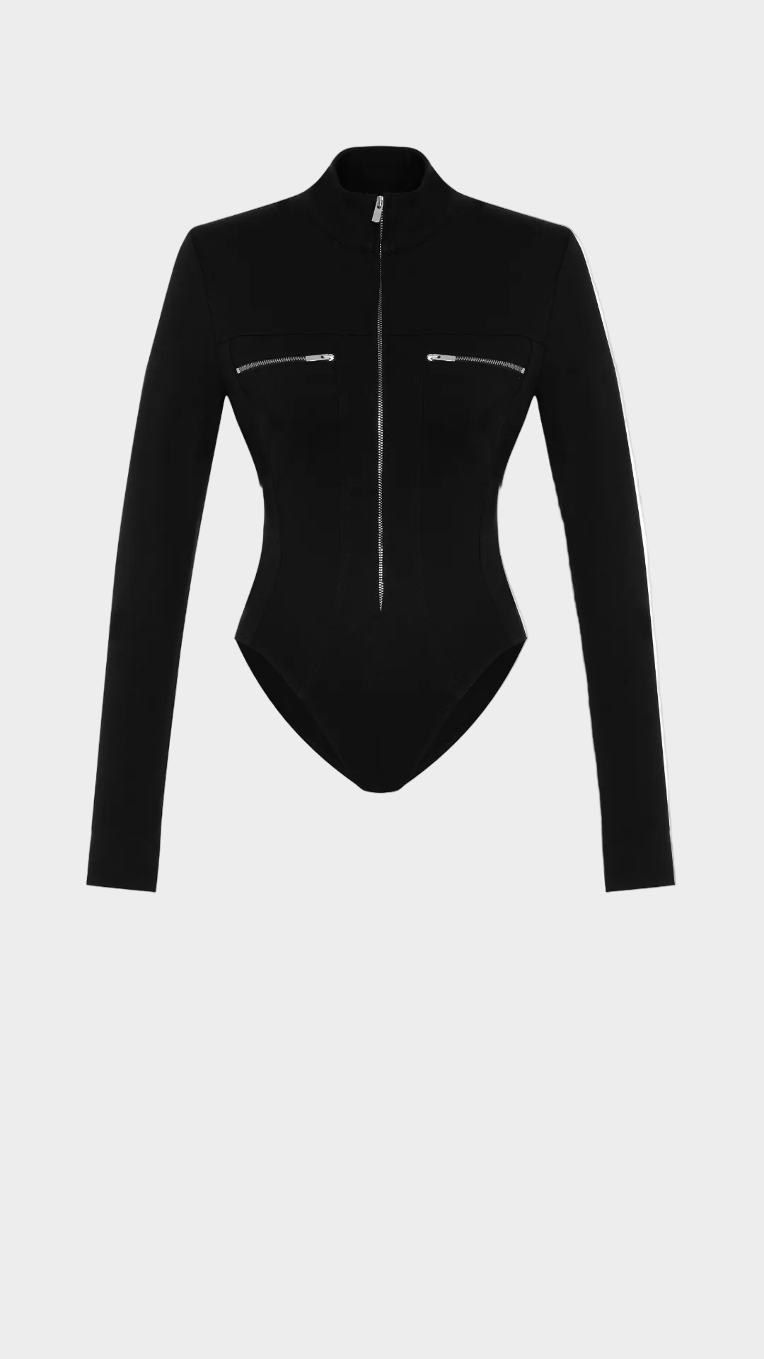 Yüksek yakalı bu bodysuit, merkezi fermuarı ve küçük göğüs cepleriyle hem sıcak tutan hem de teknik kumaşın avantajlarını sunarak şık ve fonksiyonel bir görünüm oluşturur.