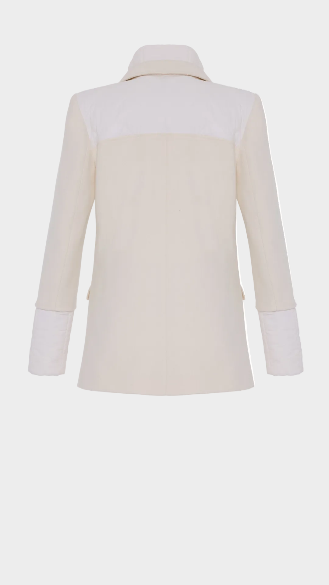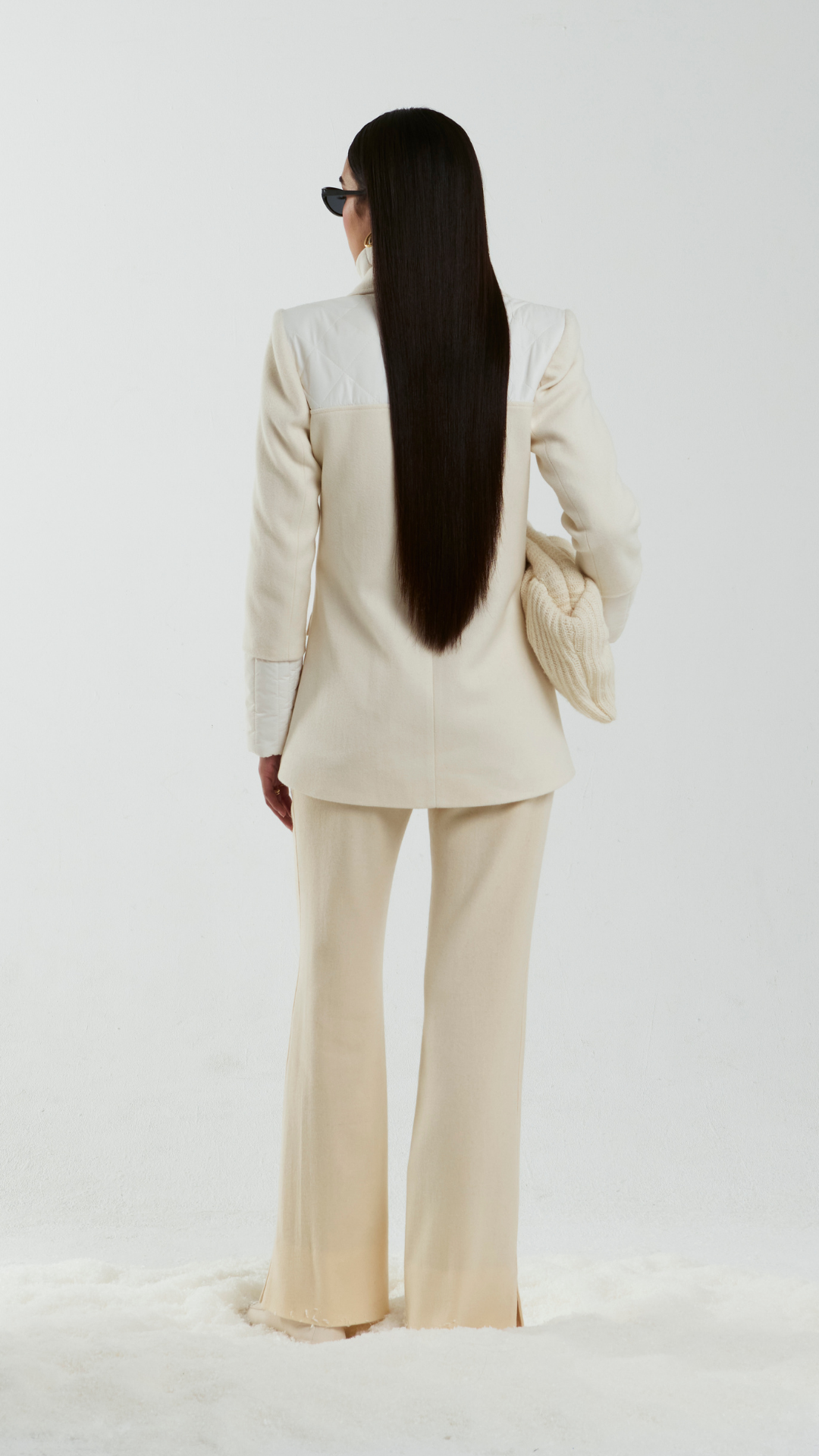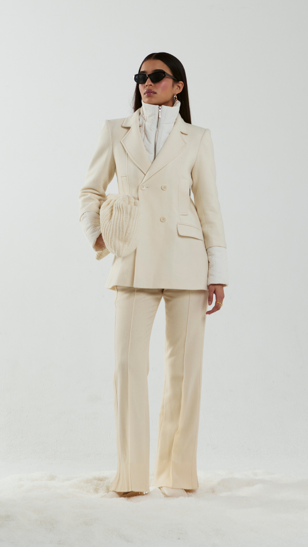 Çift sıra düğmeli yün blazer, entegre yüksek yakalı puffer yelek ve fermuar kapamasıyla tasarlanmıştır. Terzi işçiliğinin zarafetini fonksiyonel sıcaklıkla buluşturarak hem rafine hem de çok yönlü bir görünüm sunar.
